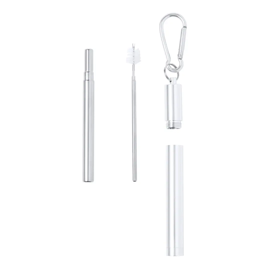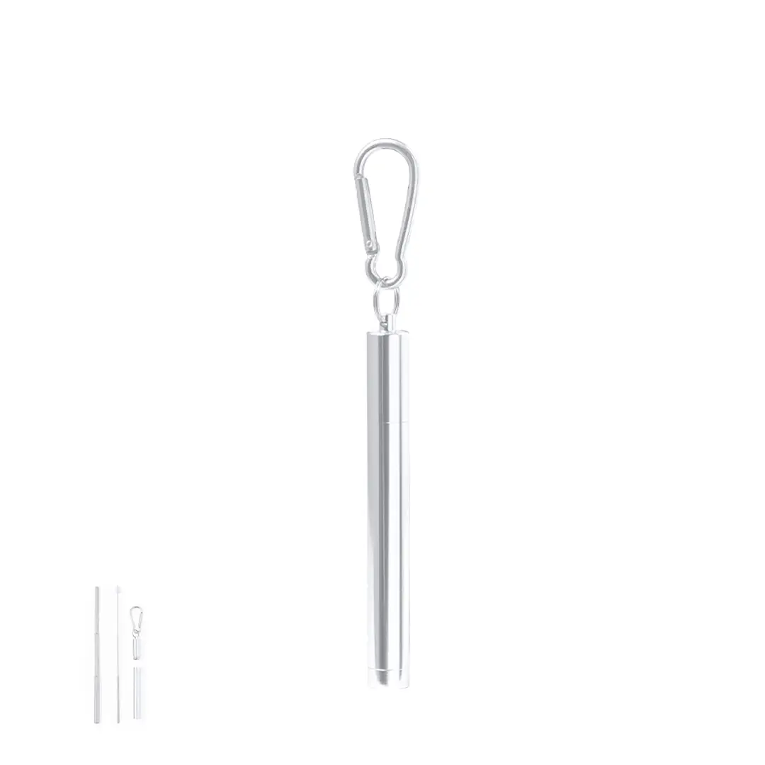 Pajita reutilizable y extensible en acero inox, con boquilla de silicona. Con accesorio limpiador incluido y presentada en estuche a juego con mosquetón para transporte.