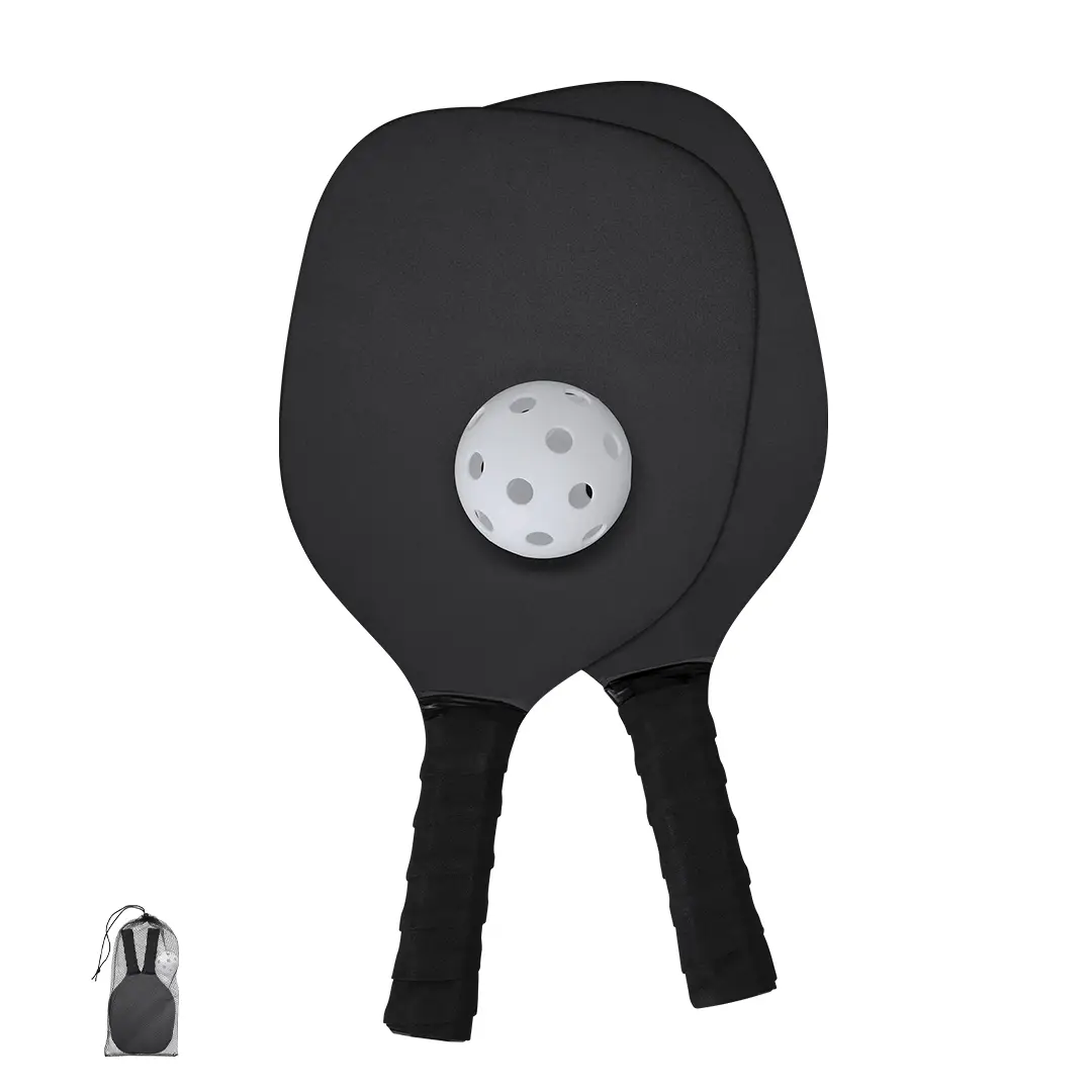 Par de palas de Pickle Ball de madera MDF en acabado mate con pelota. Mango recubierto en suave EVA en color negro para mejor agarre. Incluye bolsa de malla RPET para guardar y fácil de transportar.