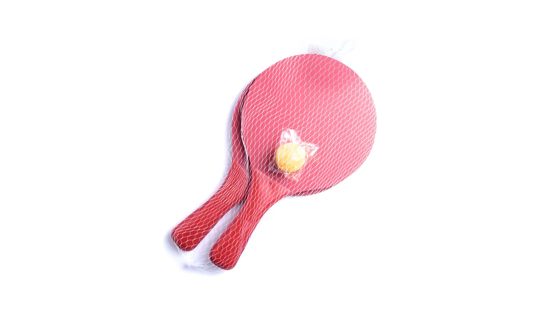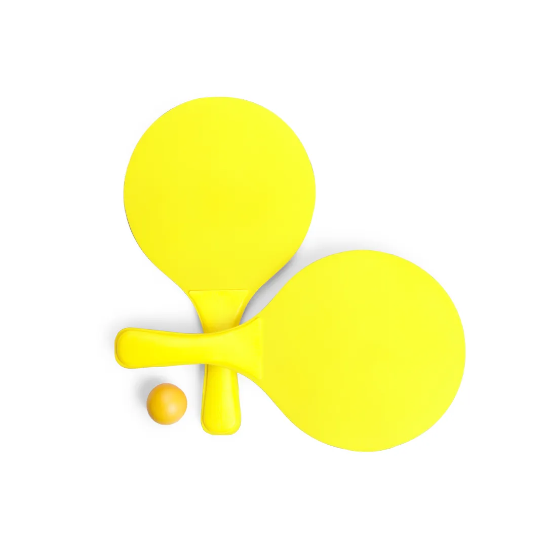 Par de palas de playa de alta calidad en madera natural de variada gama en vivos colores. Con mango reforzado a juego y presentadas en bolsa redecilla con pelota.