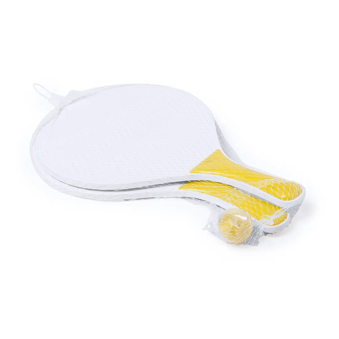 Par de palas de playa en madera natural blanca. Con mango reforzado en variada gama de vivos colores. Presentadas en bolsa redecilla con pelota a juego.