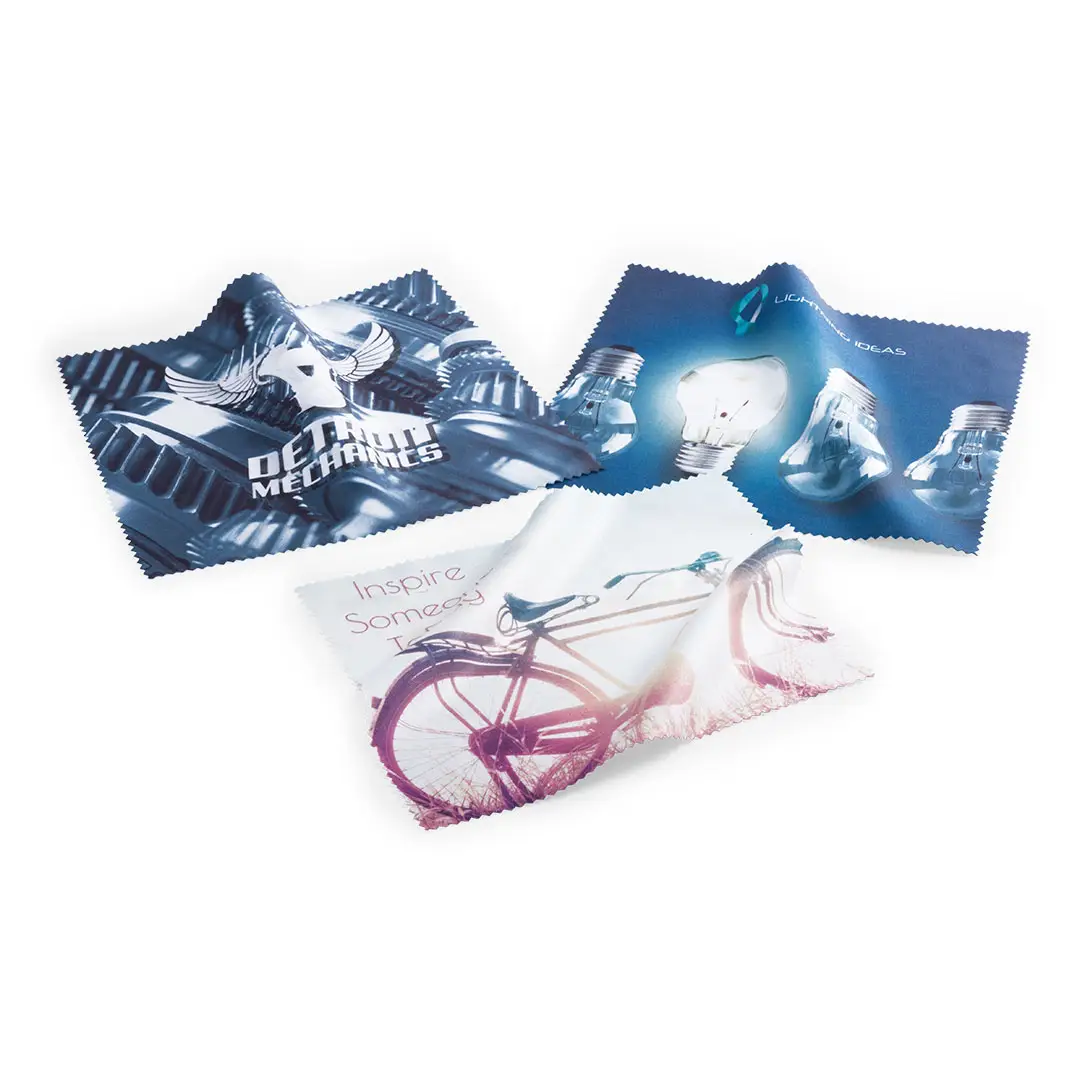Paño limpiador en suave microfibra y diseñado para marcaje en sublimación. Laterales reforzados mediante corte de seguridad en zigzag.