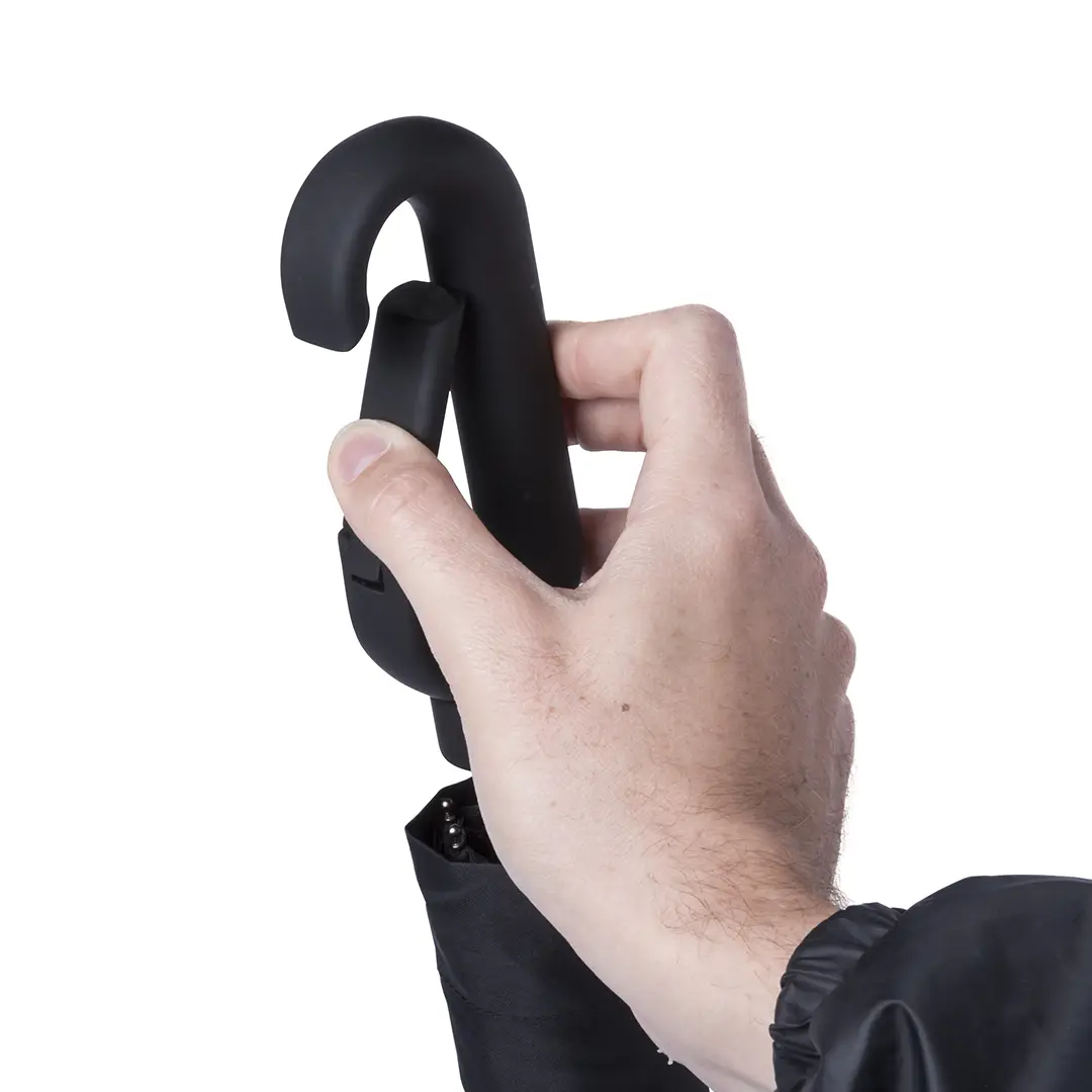 Paraguas plegable de 8 paneles en variada gama de colores. De 100cm de diámetro, apertura manual, con sistema antiviento y en resistente material pongee. Con varillas de fibra en color negro, cierre de velcro y mango ergonómico con mosquetón de enganche integrado. Presentado en funda individual a juego.