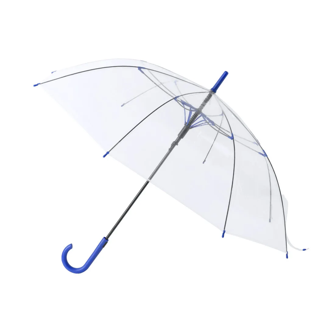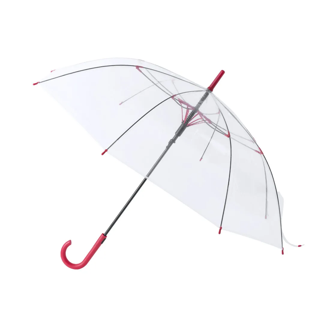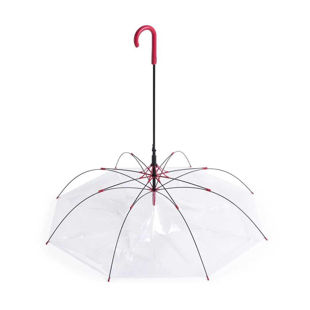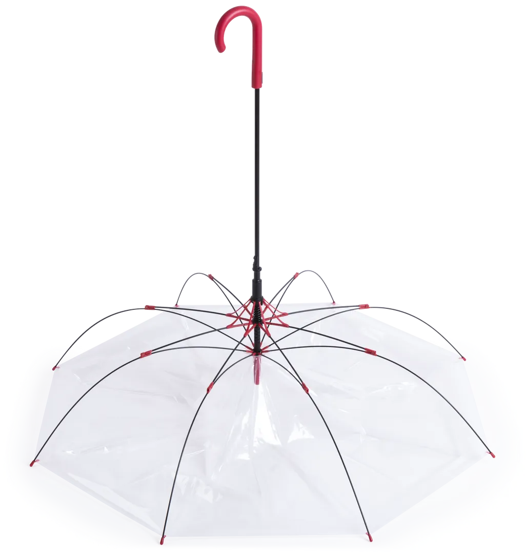 Paraguas de 8 paneles totalmente transparente, con detalles y mango en variada gama de colores. De 100cm de diámetro, con apertura automática, sistema antiviento y en resistente material POE. Con resistentes varillas de fibra en color negro, cierre de corchete y suave mango para fácil impresión.