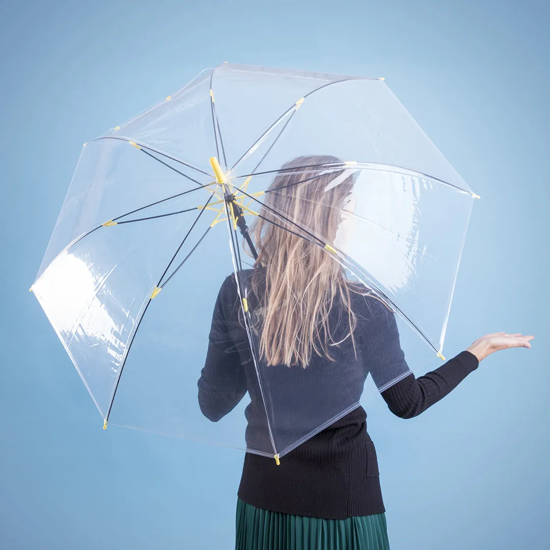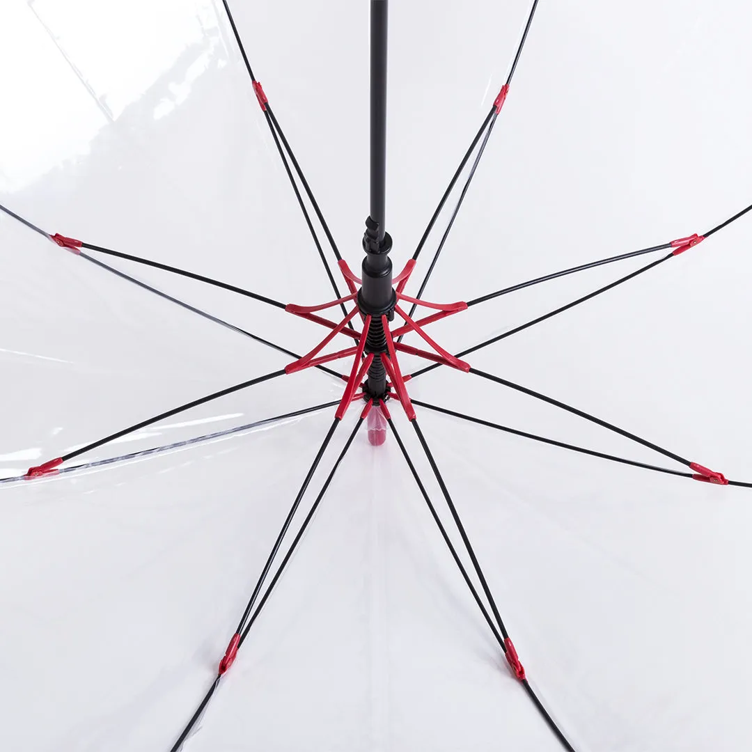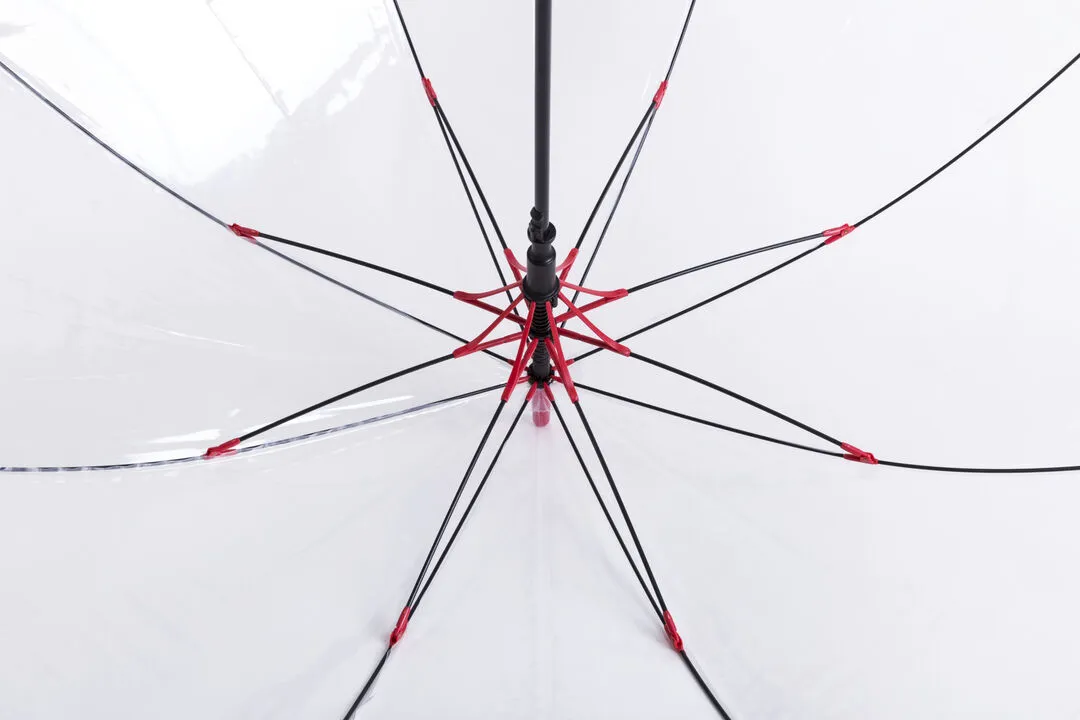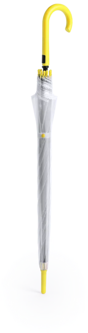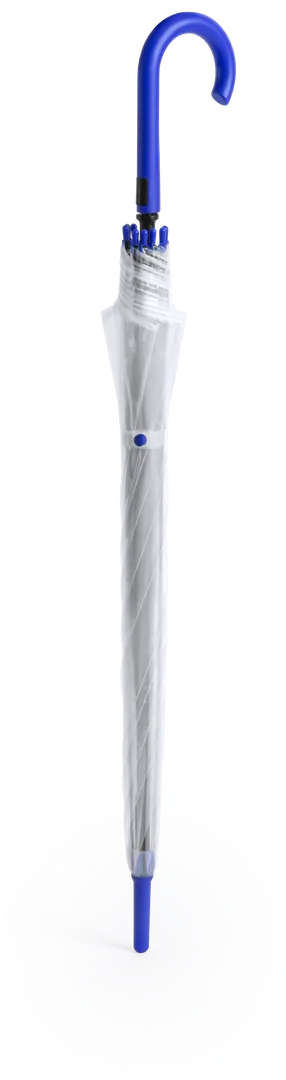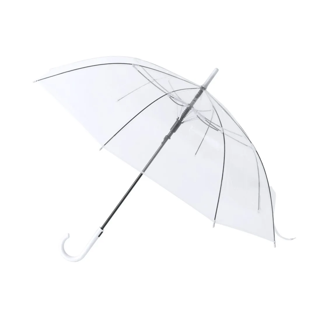 Paraguas de 8 paneles totalmente transparente, con detalles y mango en variada gama de colores. De 100cm de diámetro, con apertura automática, sistema antiviento y en resistente material POE. Con resistentes varillas de fibra en color negro, cierre de corchete y suave mango para fácil impresión.