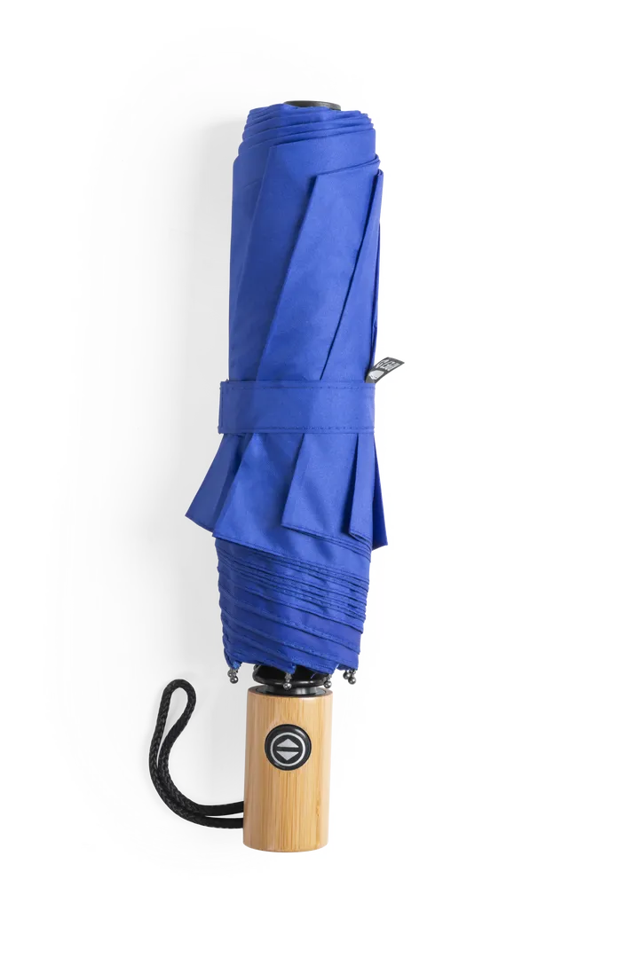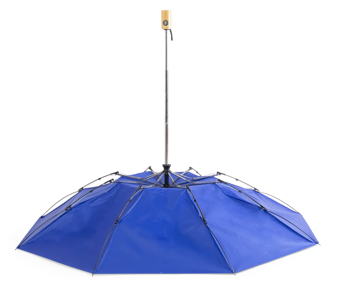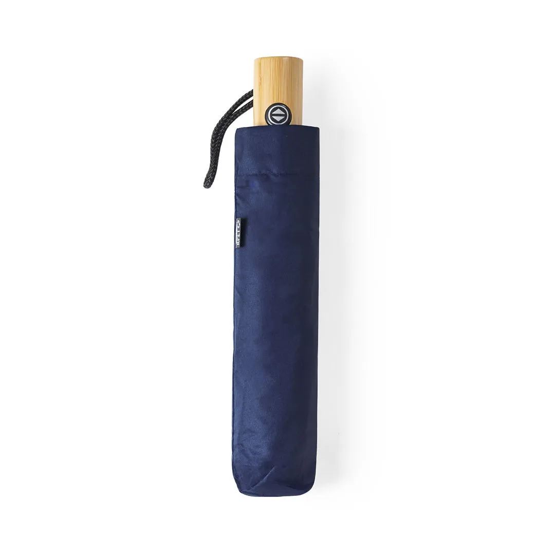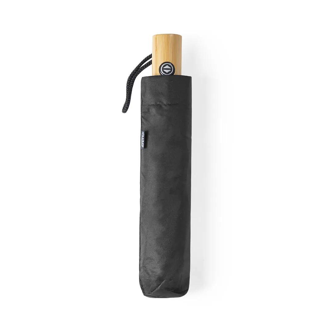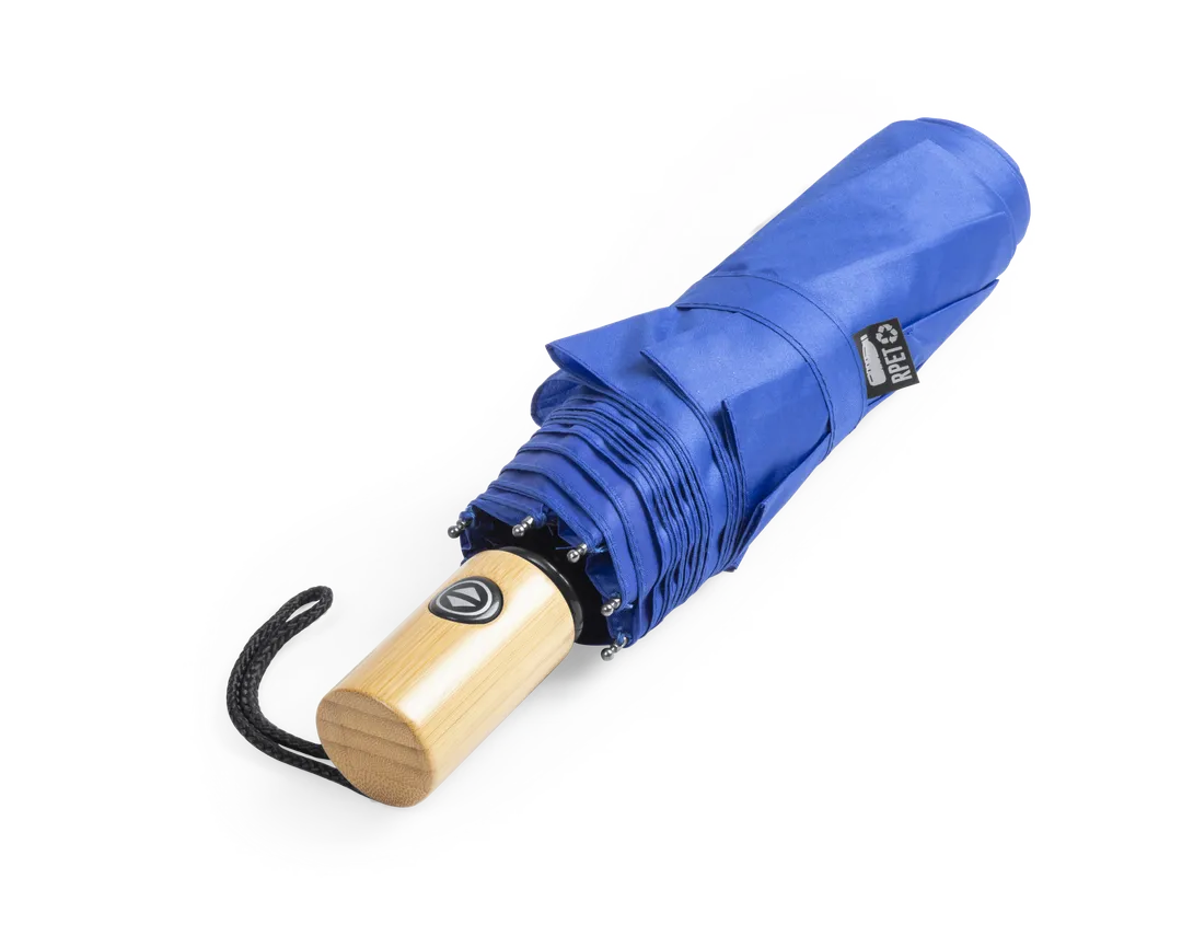 Paraguas plegable de línea nature de 103cm de diámetro. En material pongee 190T RPET, elaborado a partir de plástico reciclado, para así fomentar la reutilización de residuos plásticos y ayudar a la sostenibilidad del planeta. De apertura y cierre automáticos, con mecanismo anti viento y varillas de fibra de vidrio. Mango de bambú con botón, distintivo RPET en etiqueta y disponible en variada gama de colores. Funda RPET a juego incluida.