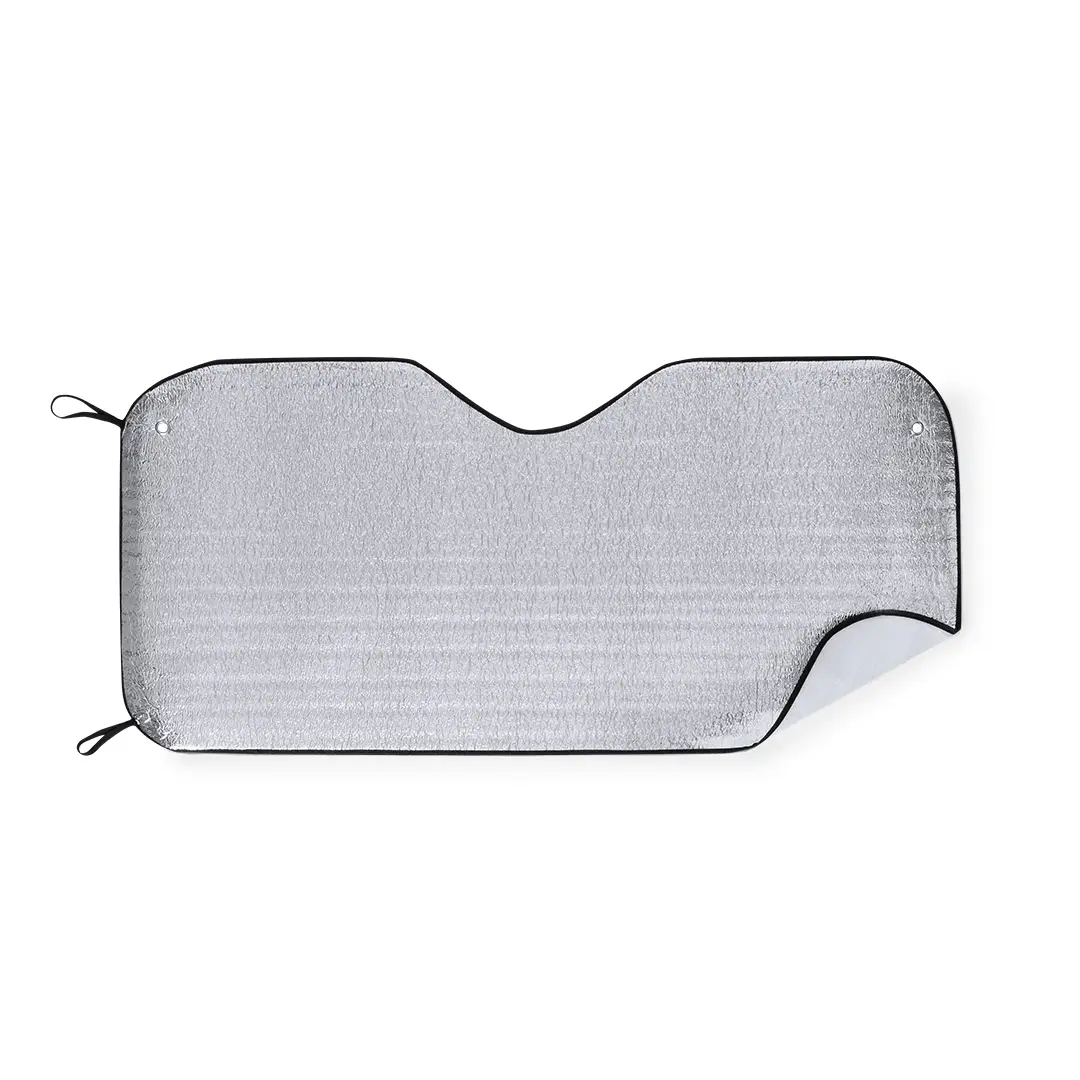 Parasol en aluminio a una cara en color plateado de acabado metalizado con ribetes de poliéster en vivos colores. De tamaño 130x60cm y espuma en el reverso. Cintas elásticas de ajuste con argollas metálicas de refuerzo, dos ventosas para ajuste en luna y presentación desplegado en plancha para fácil impresión.