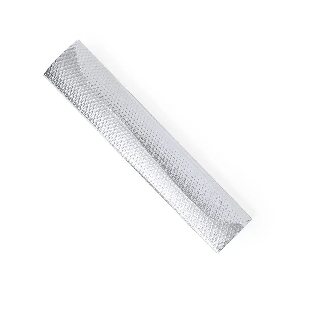 Parasol en aluminio con burbuja en ambas caras y de tamaño 130×70 cm. Acabado plateado metalizado, con original diseño sin ribetes. Fácil y rápido de plegar, con cierre de corchete. Presentación desplegado en plancha para una óptima impresión, con bolsas aparte.