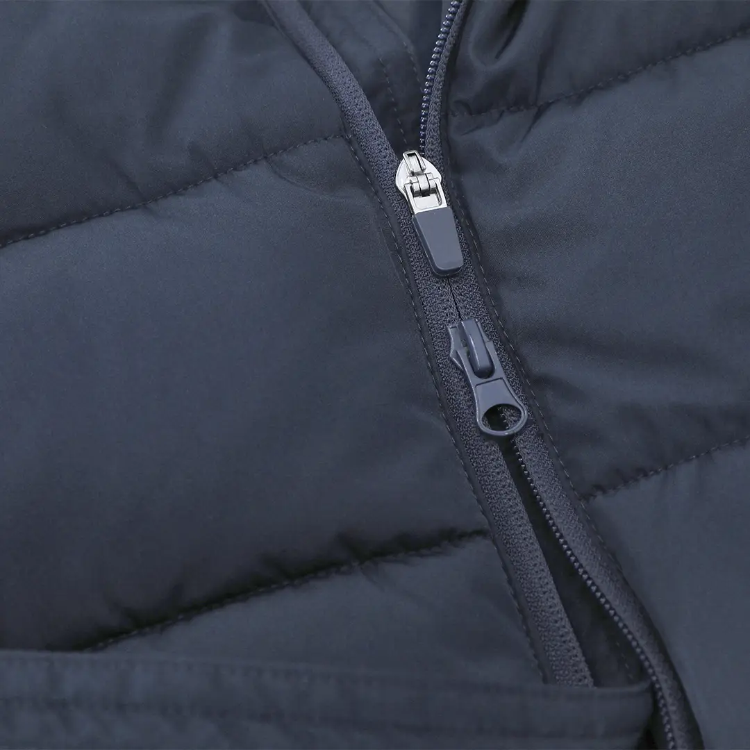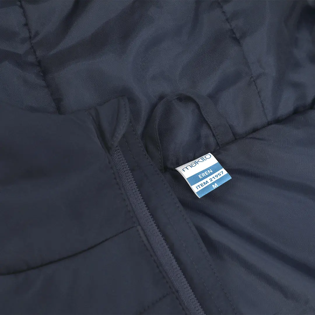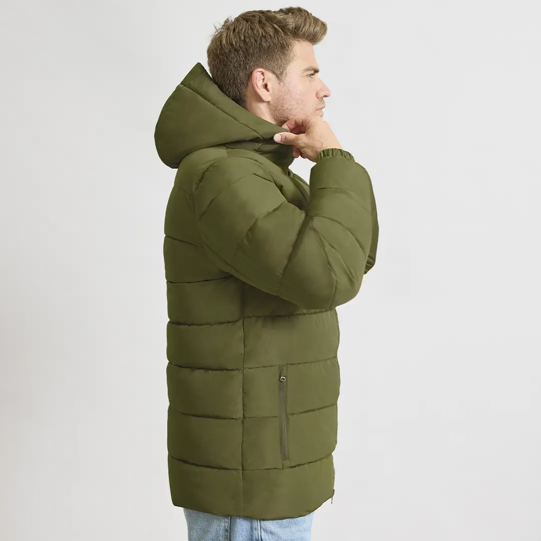Parka unisex acolchada con capucha fija y visera integrada. Incorpora cremallera frontal a tono con doble tirador y protector de barbilla. Puños elásticos para un ajuste cómodo y dos bolsillos laterales con cierre de cremallera a juego. Incluye acceso interior para marcaje en pecho izquierdo y espalda, ideal para personalización.