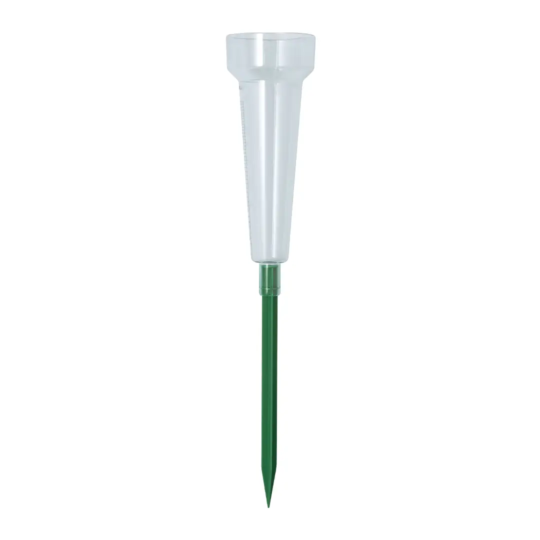 Pluviómetro de 40l/m2 con cuerpo de acabado transparente y resistente pincho de fijación.