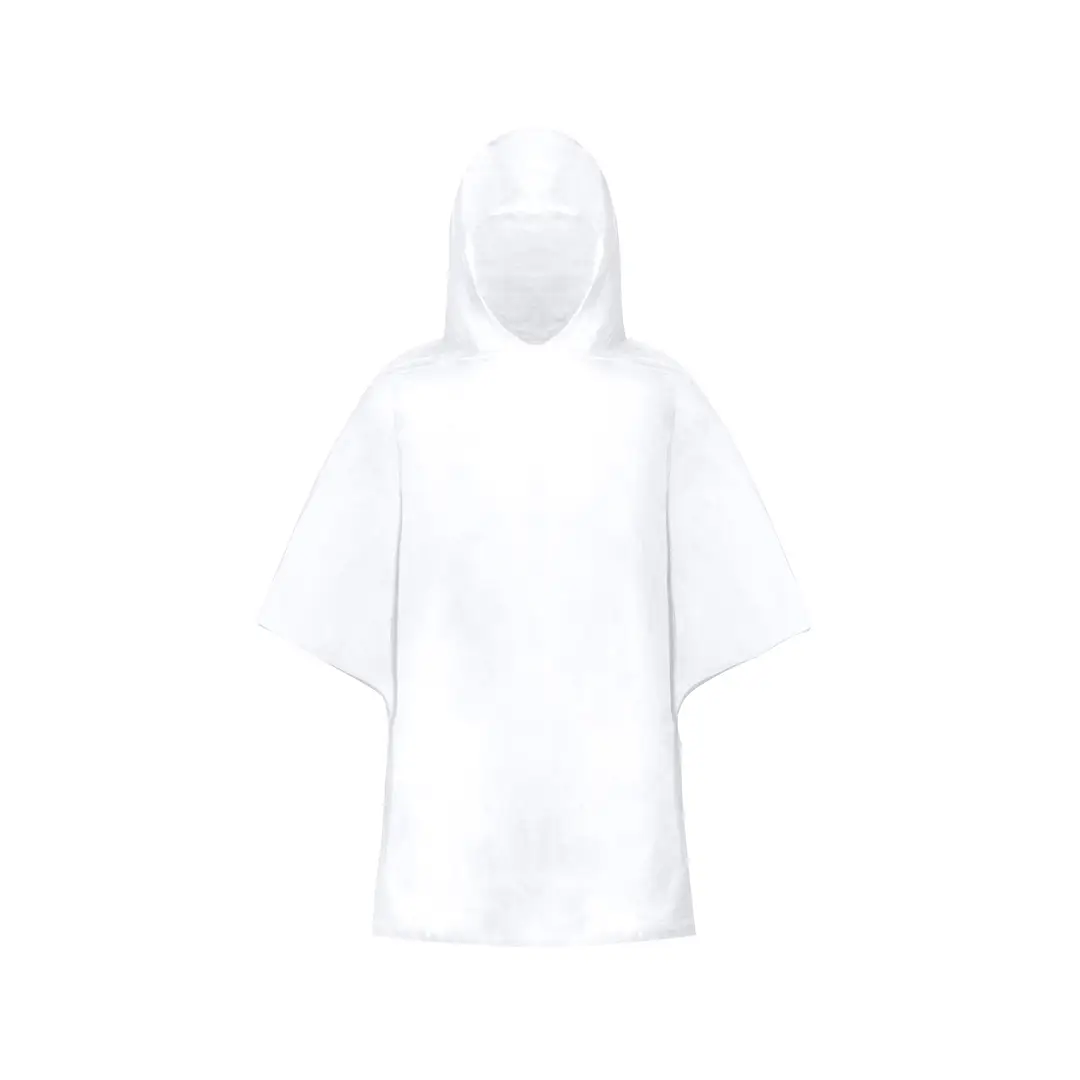 Poncho para niño en material PE. En medidas 90x64cm y presentado en funda de poliéster RPET. Bolsa con mosquetón a juego para fácil transporte y cierre ajustable, disponible en variada gama de colores. Con logotipo RPET en etiqueta exterior.El material RPET se elabora a partir de plástico reciclado, para así fomentar la reutilización de residuos plásticos y ayudar a la sostenibilidad del planeta.