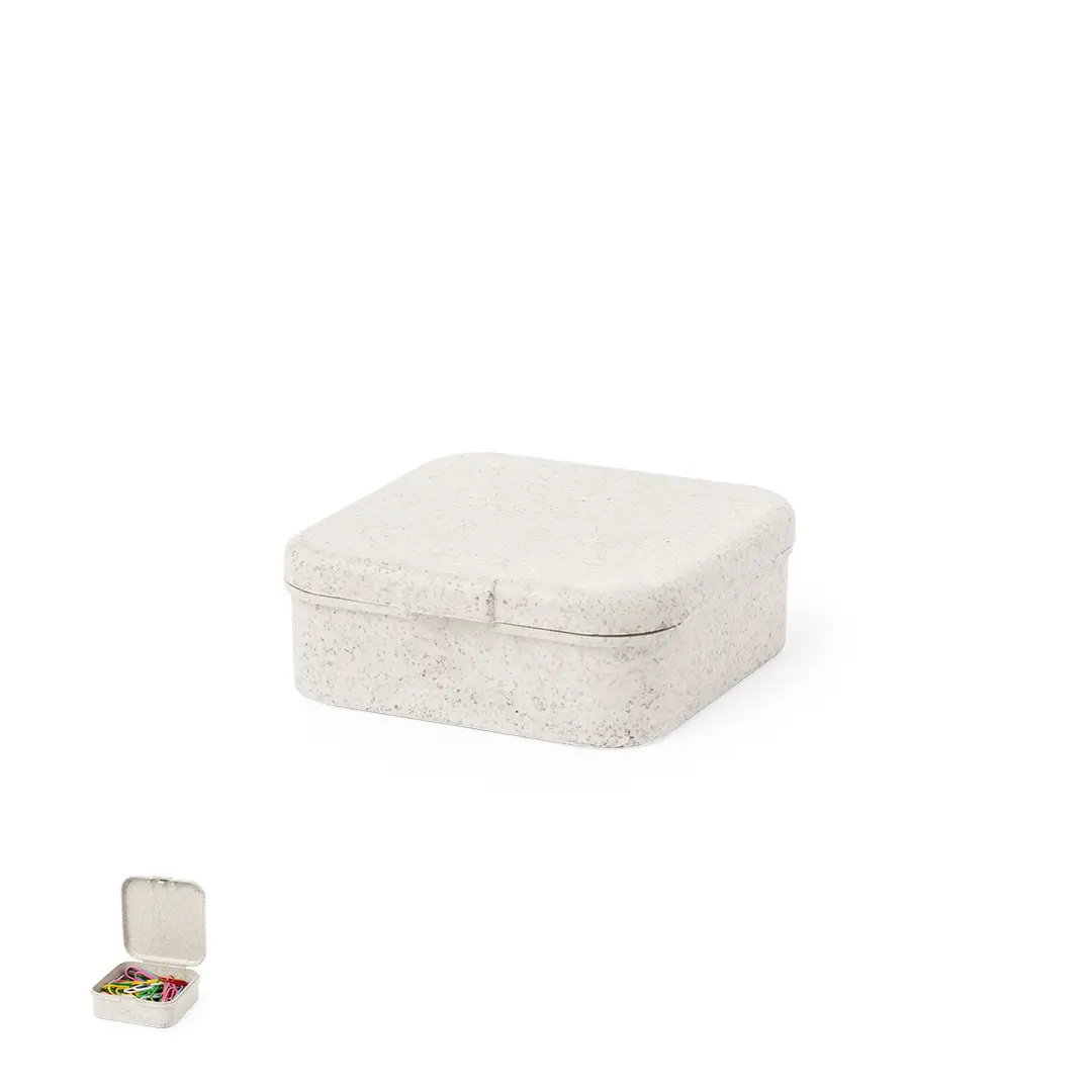 Útil portaclips fabricado en caña de trigo. Con cierre a presión y elaborada a partir de elementos reciclados, con 50 clips en su interior.La caña de trigo fomenta la utilización de materias primas naturales, reduciendo así las emisiones contaminantes.