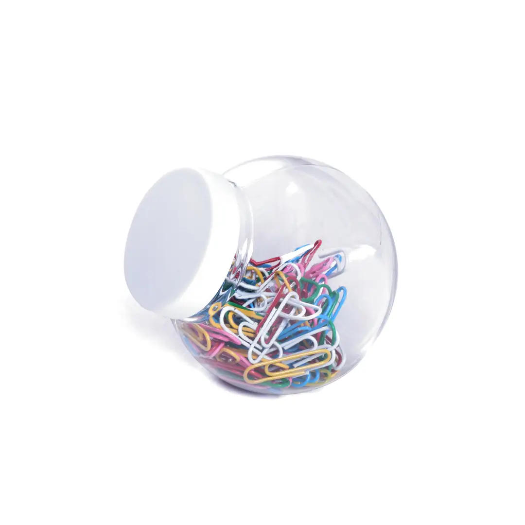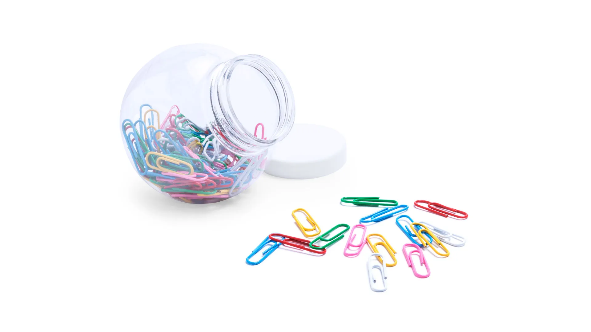 Original bote porta clips de cuerpo transparente y tapa blanca a rosca con superficie lisa para marcaje. Con 100 clips multicolor recubiertos en PVC incluidos.