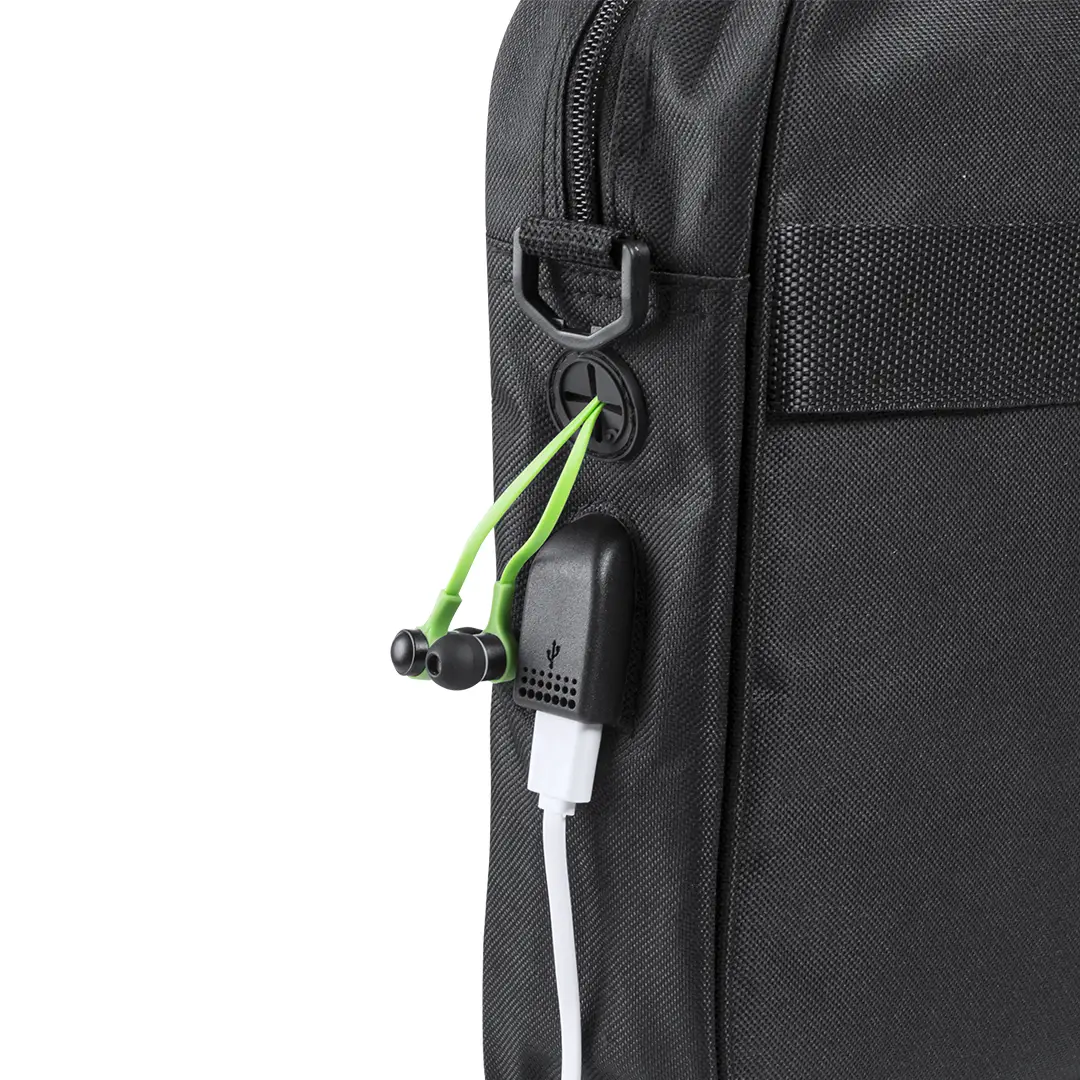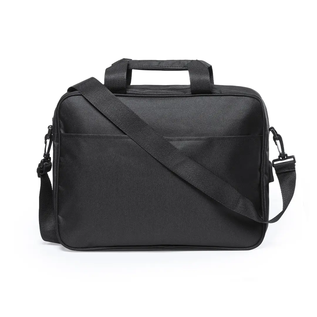 Portadocumentos en resistente poliéster 600D de acabado en color negro y de cierre de cremallera. Con salida para auriculares y compartimento interior con salida USB para conexión de powerbank -no incluido-. Con resistentes asas reforzadas y accesorio en la parte posterior para acople en barra de trolley. Interior con compartimento acolchado para ordenador portátil de hasta 15 pulgadas y compartimento para tablet de hasta 10 pulgadas. Con Multitud de bolsillos interiores y exteriores y cinta bandolera ajustable con cierre de mosquetón.