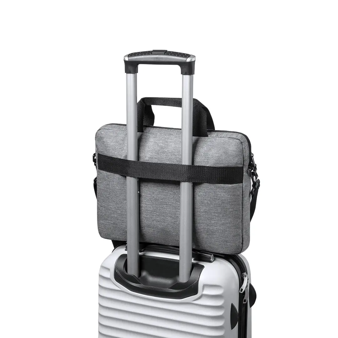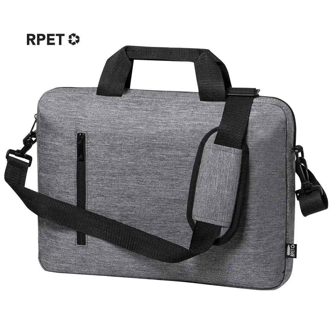Elegante portadocumentos de línea nature en resistente 600D RPET efecto melange, elaborado a partir de plástico reciclado para así fomentar la reutilización de residuos plásticos y contribuir a la sostenibilidad del planeta. Detalles en negro, incluye compartimentos interiores acolchados para ordenador de hasta 15 pulgadas y tablet de hasta 10 pulgadas. Accesorio en parte posterior para anclaje al trolley, bolsillo exterior con cierre de cremallera, cómodas asas reforzadas, cinta bandolera ajustable con cierre de mosquetón y almohadilla para hombro a juego. Distintivo RPET en etiqueta exterior.