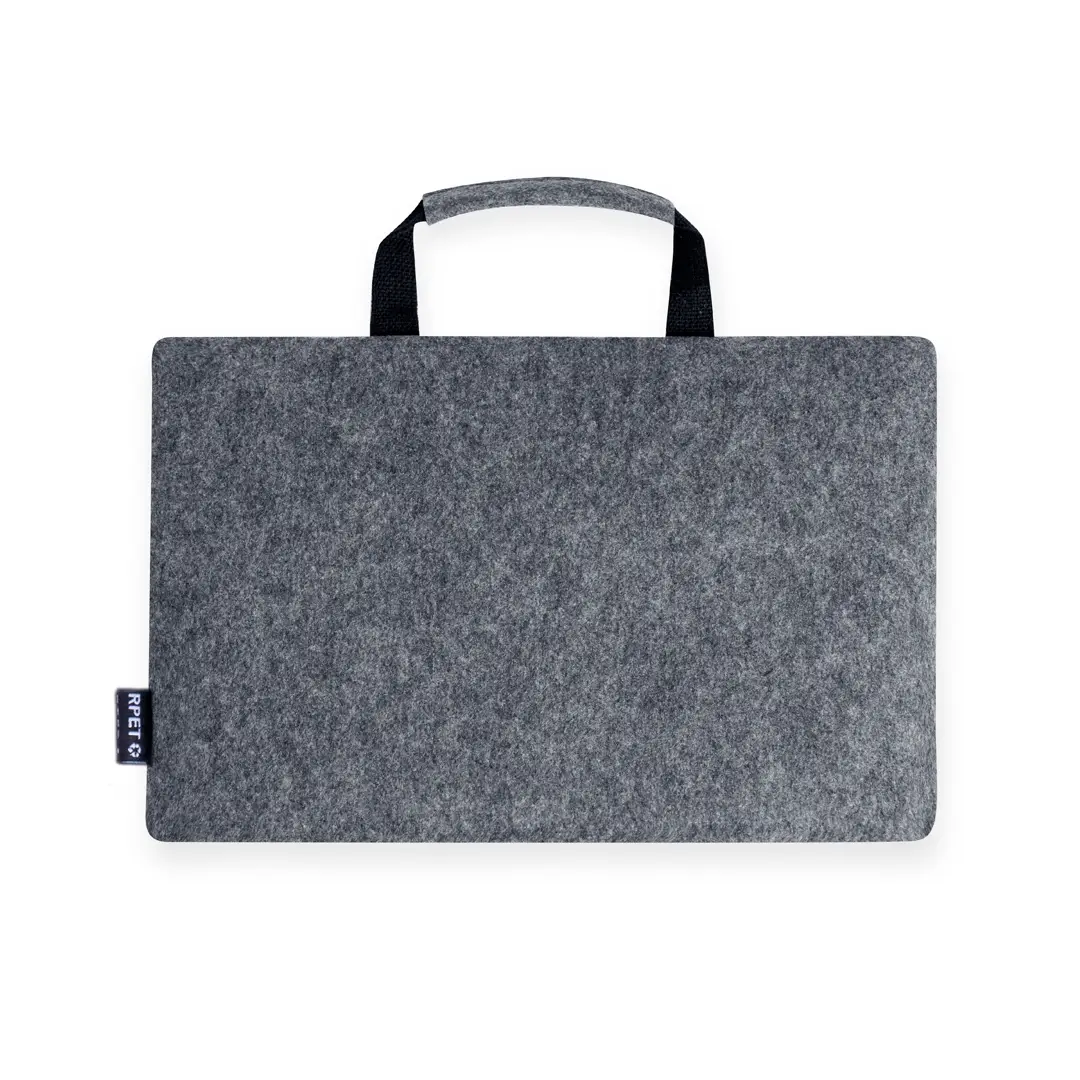 Portadocumentos en resistente fieltro RPET efecto melange. Compartimento principal con cierre de cremallera, para ordenador portátil de hasta 15 pulgadas, y pequeño bolsillo interior. Con resistentes asas a juego con detalles en negro. Logotipo RPET en etiqueta exterior. El fieltro RPET es fruto de la combinación del proceso de reciclaje de materiales plásticos junto con la técnica milenaria de fabricación del fieltro, dando como resultado un material de eco-tendencia que, además de ser de origen reciclado, también se convierte en reciclable.