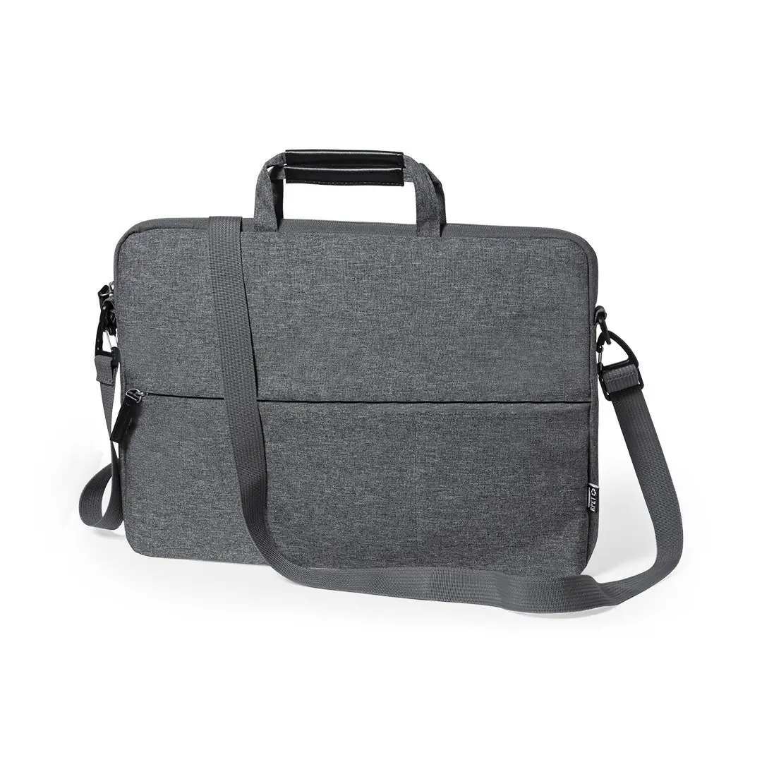 Portadocumentos de línea nature y en resistente 300D RPET efecto melange, elaborado a partir de plástico reciclado, para así fomentar la reutilización de residuos plásticos y contribuir a la sostenibilidad del planeta. Con original soporte integrado para ordenador portátil, bolsillos principal y frontal con cierre de cremallera. Interior con bolsillo acolchado para portátil de hasta 15 pulgadas y bolsillo para tablet de hasta 10 pulgadas. Cinta bandolera ajustable para hombro, con asa de transporte reforzada. Resistencia hasta 6kg, con distintivo RPET en etiqueta exterior.