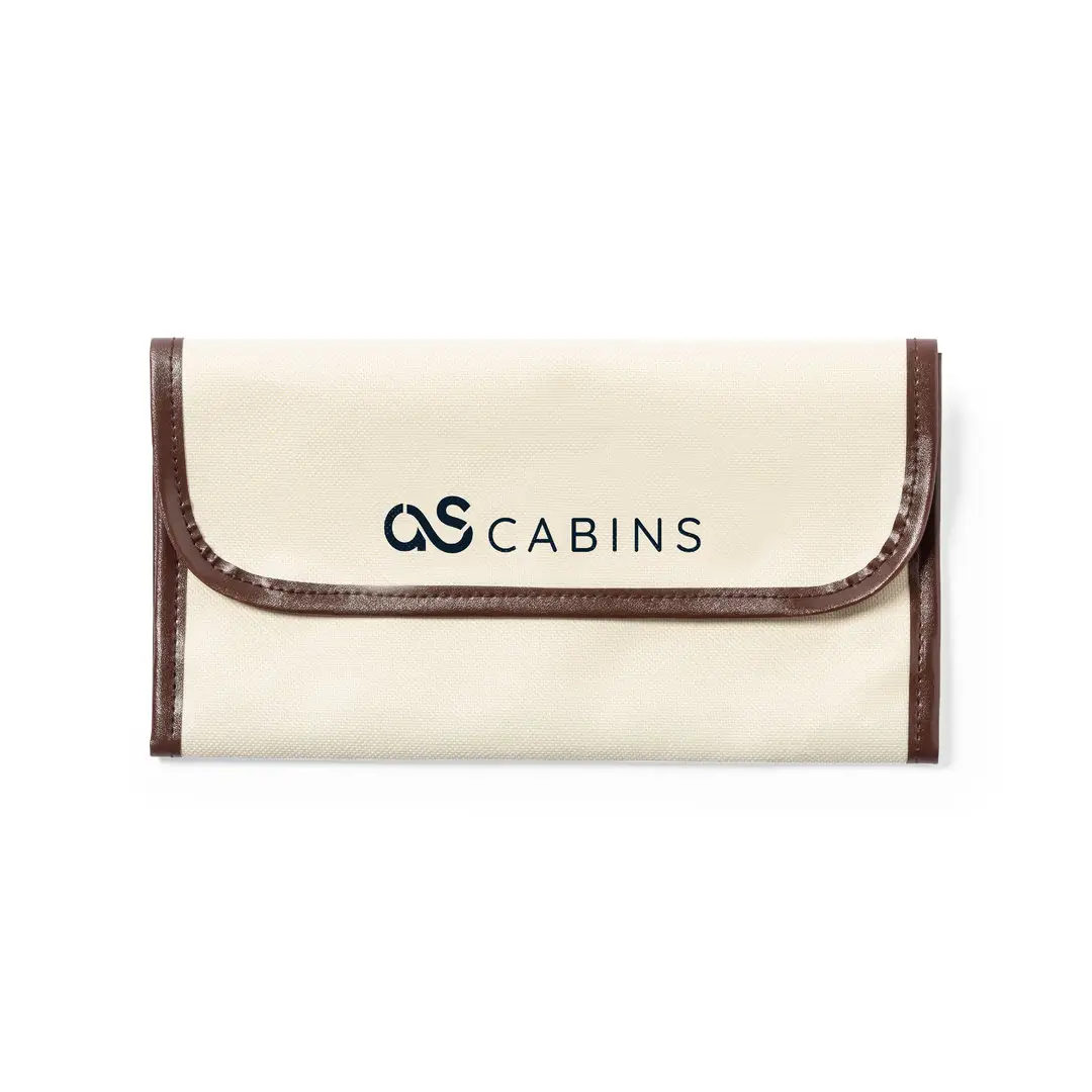 Portadocumentos de viaje fabricado en resistente 600D de acabado natural, con ribetes y refuerzos en polipiel marrón. Solapa con cierre de velcro y multitud de compartimentos interiores.