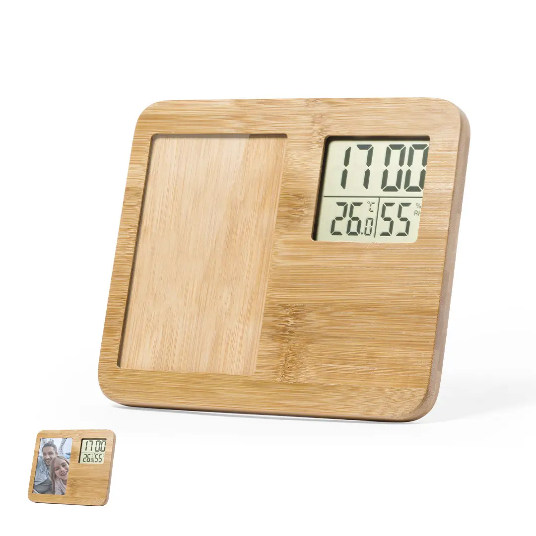 Portafotos estación meteorológica de línea nature, fabricada en bambú pulido y con funciones termómetro, higrómetro y reloj. Para fotos de 9x14cm y con reloj con alimentación a pilas (de botón incluidas). Presentado en atractiva caja de diseño eco. Disponible manual de instrucciones en español e inglés.