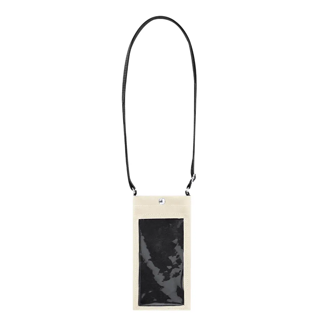Portatodo en elegante PU. Con pantalla transparente con funcionalidad touchscreen. Cierre en botón para mayor seguridad. Cintas de transporte ajustables.