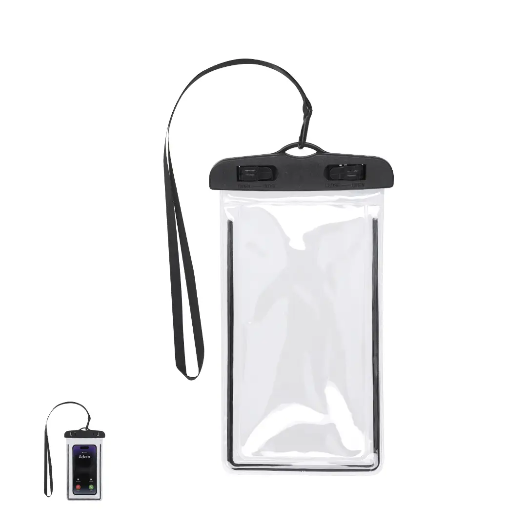 Portatodo impermeable fabricado en PVC, diseñado con función táctil para facilitar el uso de dispositivos. Con sistema de seguridad con cierre de palancas para una buena estanqueidad. Compatible con pantallas de hasta 6,7 pulgadas. Incluye cordón y mosquetón a juego para mayor comodidad.