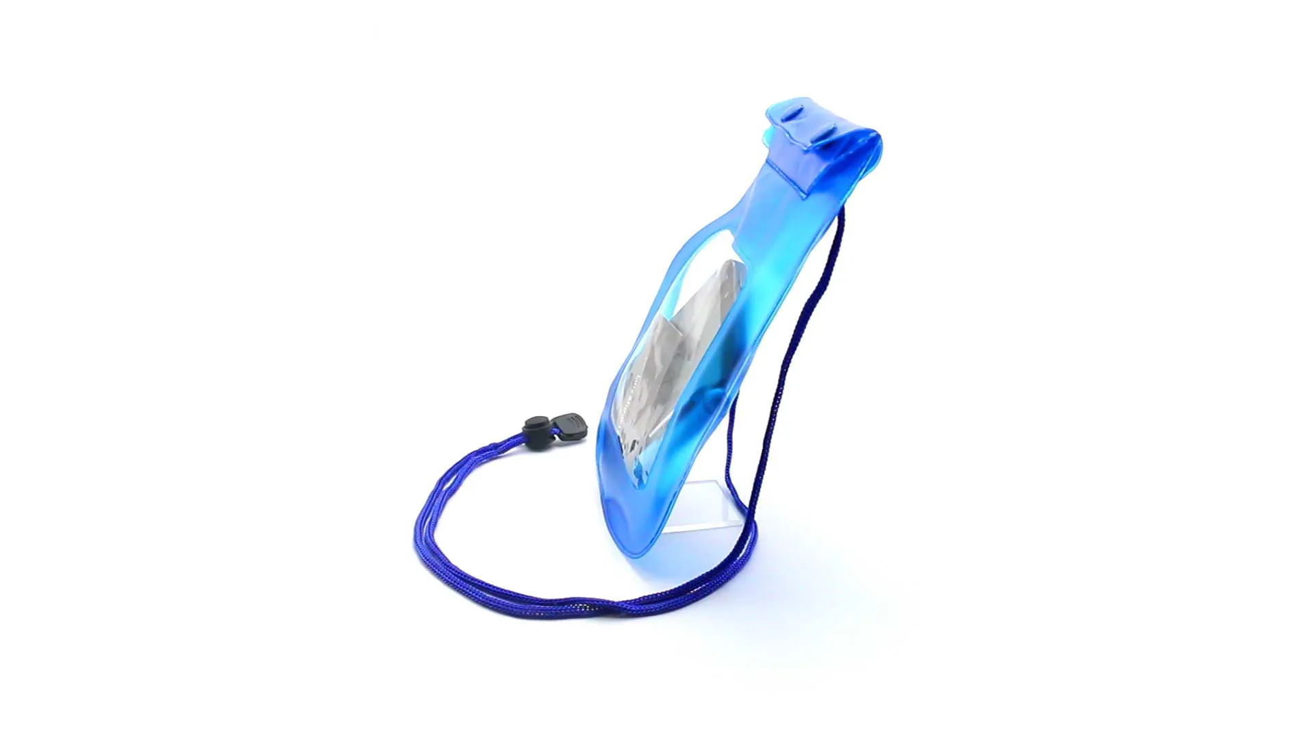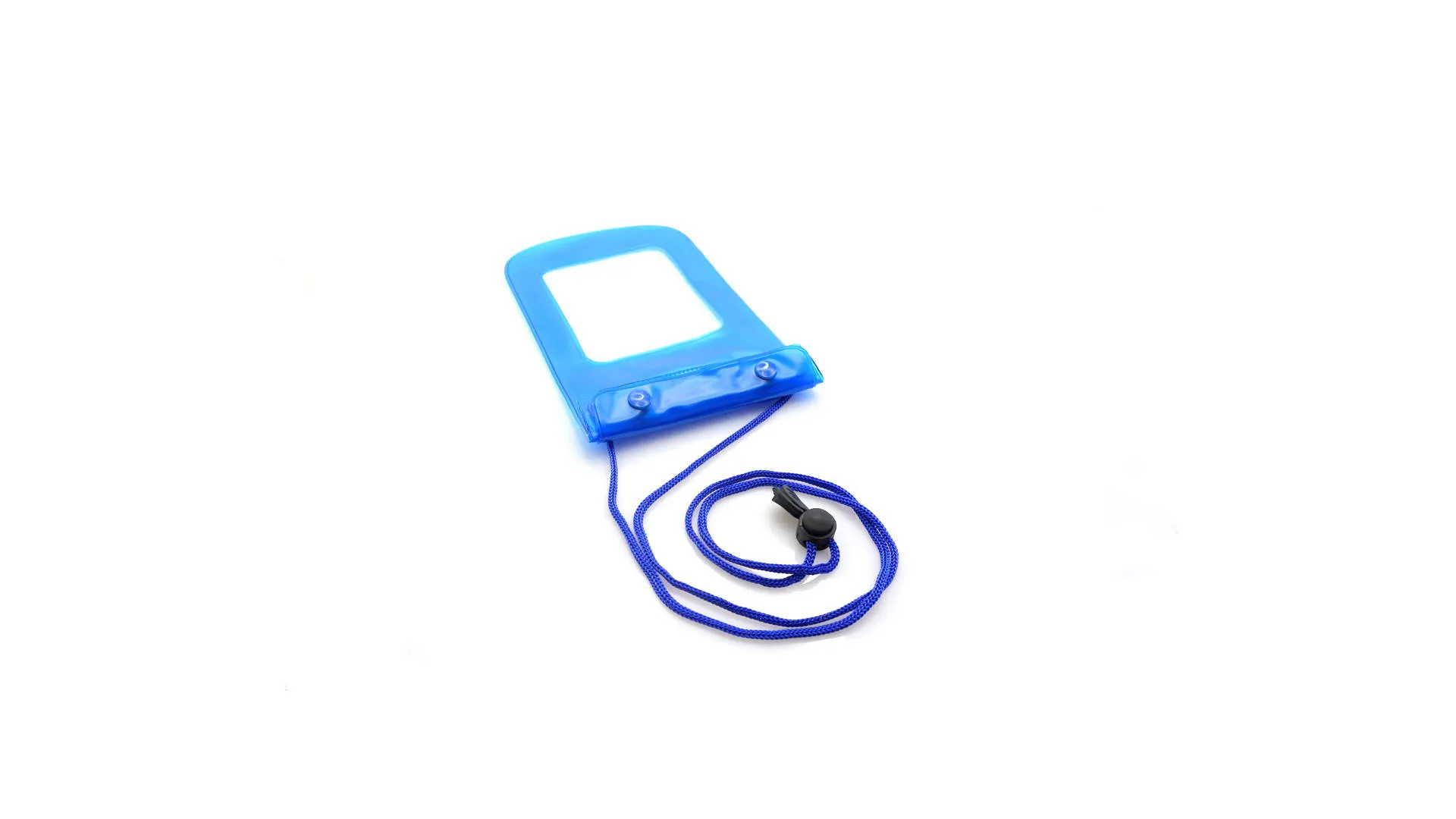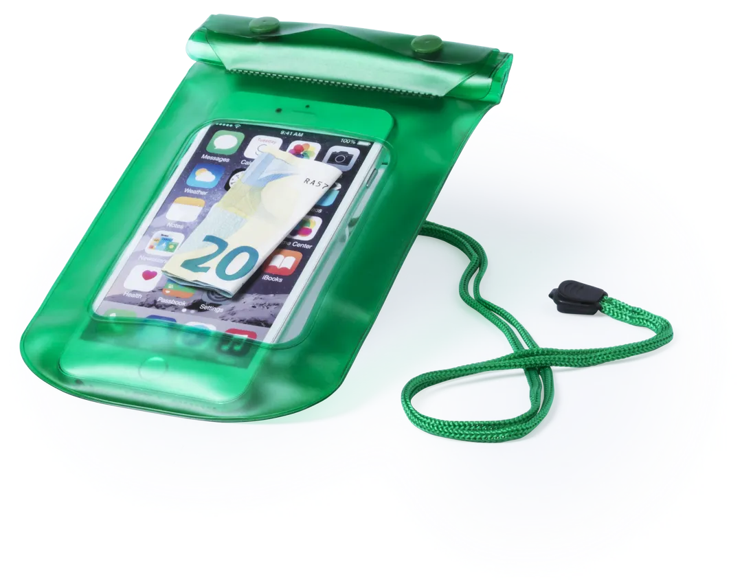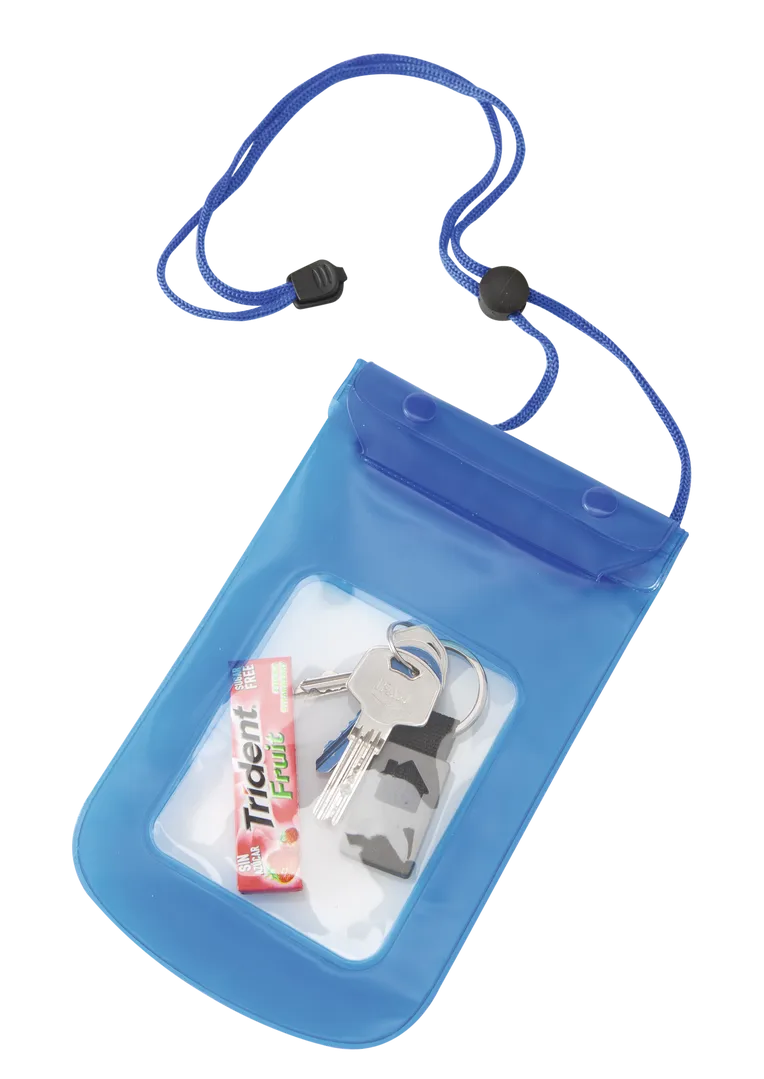 Práctico portatodo impermeable en PVC de acabado translúcido con ventana frontal transparente. Con función táctil y cierre estanco. Solapa con cierre de corchete a juego y cinta de transporte a juego con accesorio de ajuste.