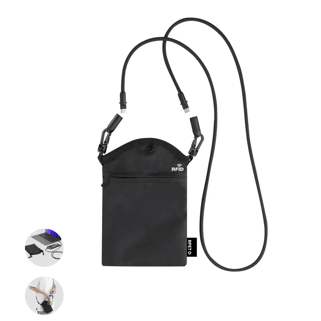 Portatodo fabricado en RPET. Compartimento principal con cierre de botón y bolsillo en la parte frontal con sistema de cierre en cremallera. Incluye sistema de protección RFID, diseñado para bloquear accesos no autorizados a tarjetas contactless.Cinta de transporte 2 en 1 unida mediante mosquetones con función de cable apto para transferir datos, con conexión Tipo C de 60W. Incluye distintivo logotipo RFID y RPET.