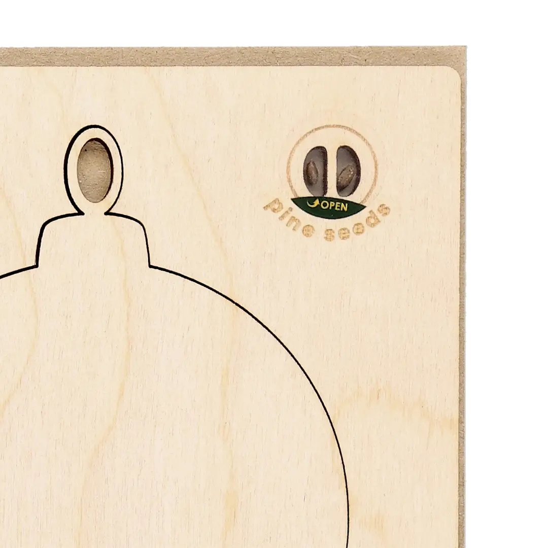 Sostenible y original set de postal navideña con adorno incluido en forma de bola de navidad y cápsula interior con semillas de pino, un regalo respetuoso con el medio ambiente a la vez que sorprendente. Contenido:Postal fabricada en papel de acabado Kraft. Bola de navidad de madera natural con troquelado en el interior. Cápsula de semillas de pino integrada en el interior.Elaborado con elementos vegetales para así fomentar la utilización de materias primas naturales y reducir las emisiones contaminantes.