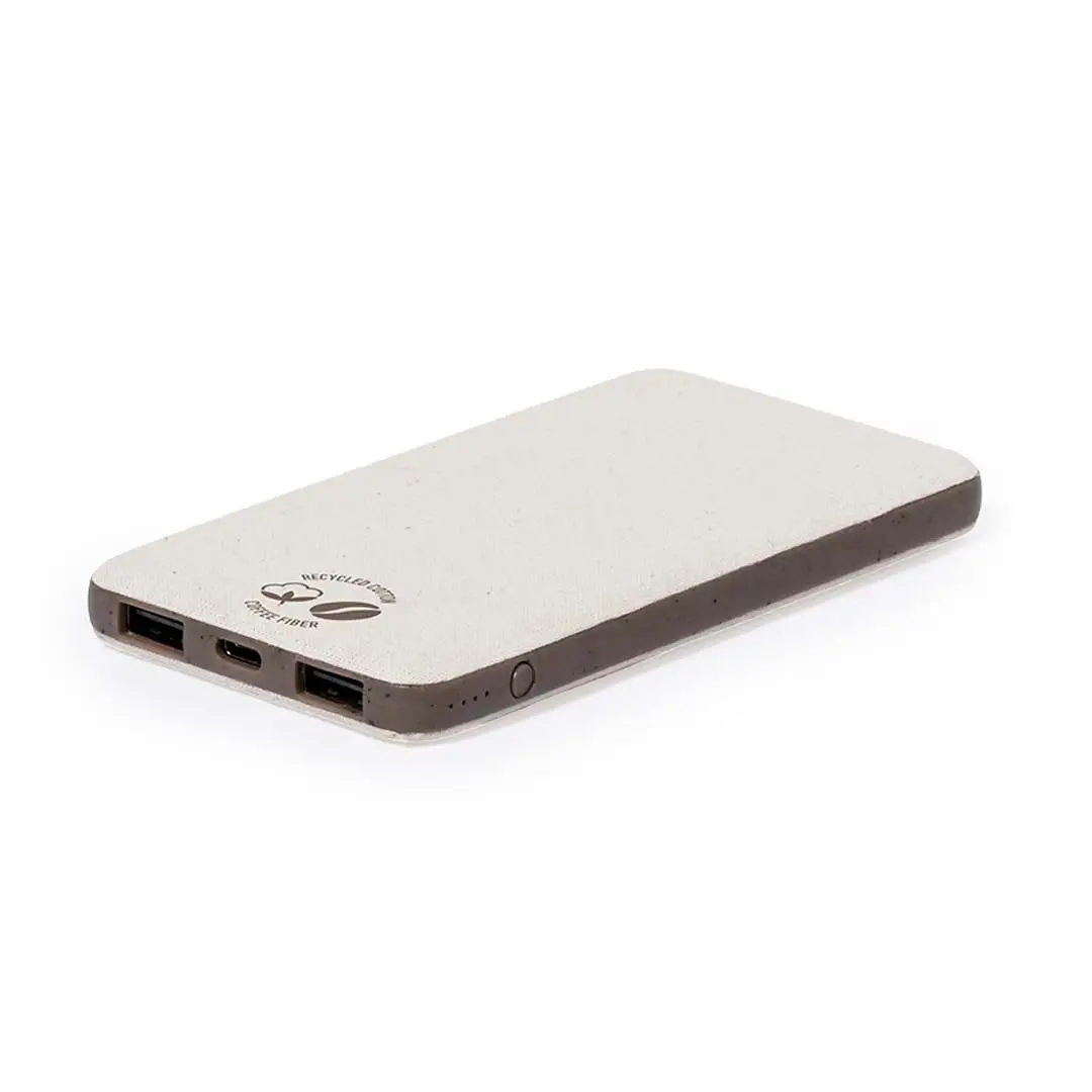 Batería auxiliar externa de 5.000 mAh, fabricada en fibra de café y algodón reciclado. Con 2 salidas USB, entrada micro USB y conexión dual de entrada y salida Tipo C. Cable de carga Tipo C incluido, y presentada en caja individual de diseño kraft. Con distintivos de fibra de café y algodón reciclado. Disponible manual de instrucciones en español e inglés.La fibra de café es una solución circular que se obtiene de la utilización de los residuos producidos en la obtención del café. Una alternativa sostenible que favorece la reducción del uso de plásticos, ahorrando energía en su proceso de fabricación y contribuyendo al cuidado del medio ambiente.Entrada/Salida USB C: 5V DC 2.4VSalida USB: 5V DC 2.4AEntrada Micro USB: 5V DC 2.1A Las capacidades mostradas en todas nuestras baterías auxiliares externas son reales, incorporando todas ellas baterías de grado A y no recicladas, con una vida útil de al menos 500 ciclos de carga y según normativa CE.Además, están fabricadas conforme a los estándares RoHS y en cumplimiento con los siguientes requisitos de seguridad:Sistema de protección contra sobrecarga del power bank.Sistema de protección contra descarga completa que proporciona una mayor durabilidad del power bank.Sistema de bloqueo para evitar cortocircuitos.Sistema de transferencia de carga constante, acorde con la capacidad del dispositivo de destino.Disponible certificación GRS (Global Recycled Standard / Estándar de Reciclaje Global), que garantiza el origen reciclado del material usado para fabricar el producto.