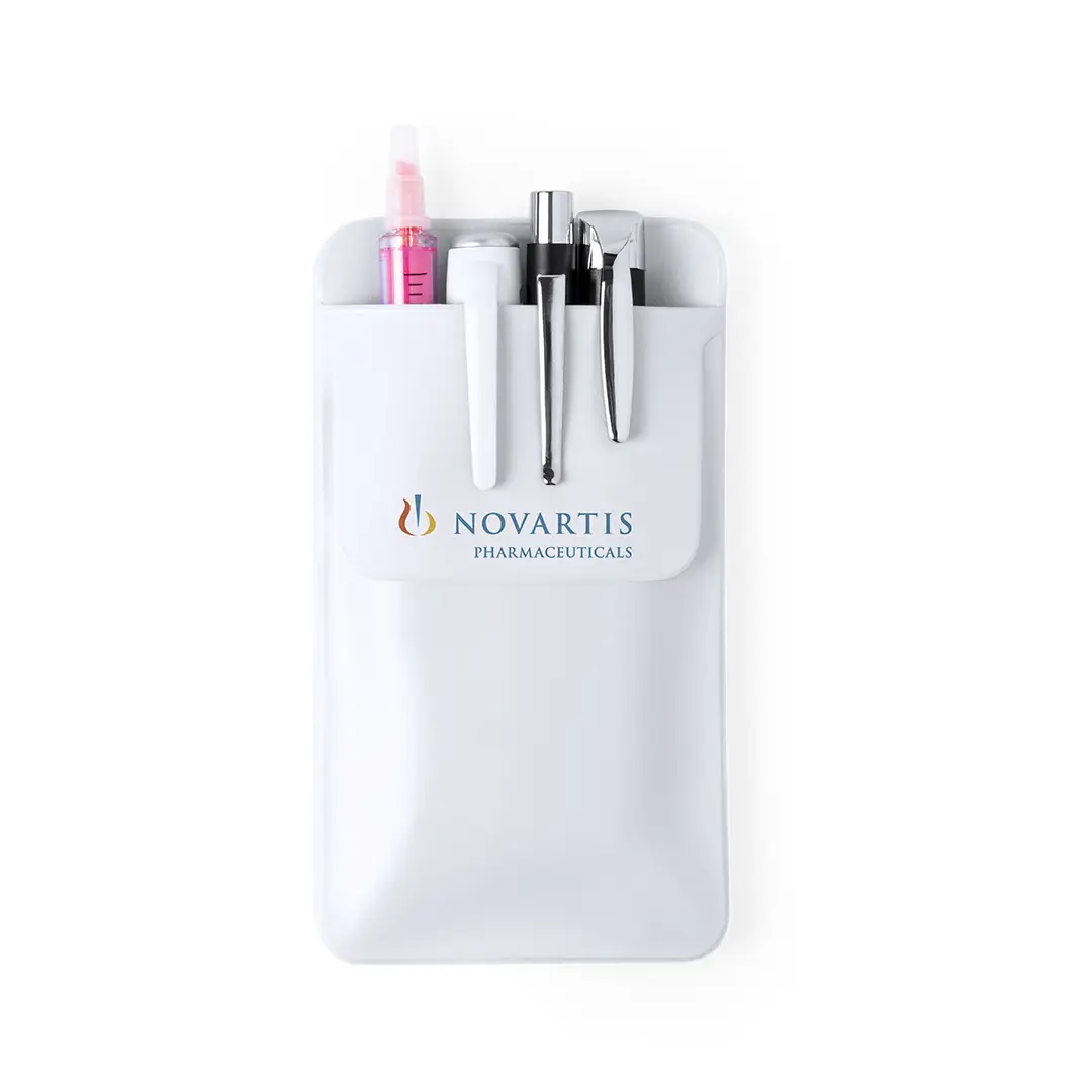 Protector de bolsillo para guardar bolígrafos y otros utensilios. En resistente PVC de acabado termosellado, con solapa para fácil impresión.
