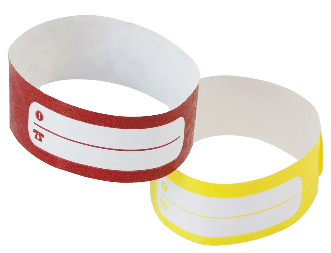 Pulsera en fibra sintética para niño en variada gama de vivos colores. Con campos de identificación, de cierre adhesivo, resistente al agua y presentada en plancha troquelada de 10 piezas.