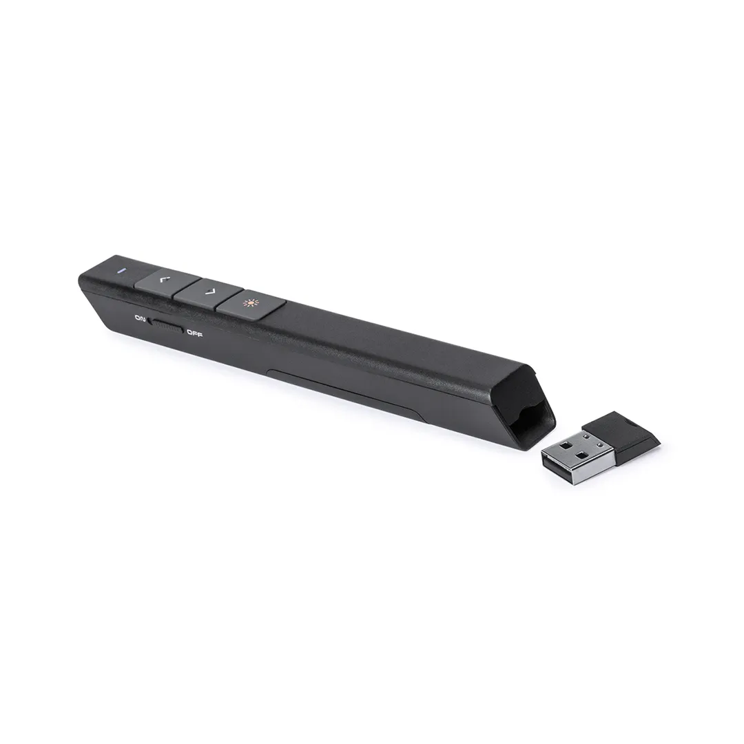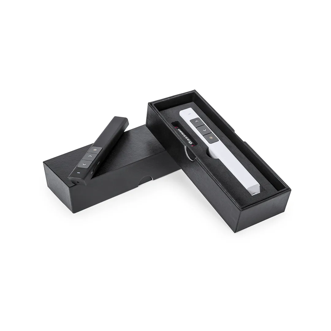 Elegante puntero láser de clase 2 con conexión USB y de suave acabado. Especialmente diseñado para presentaciones PowerPoint y Keynote, incorpora pulsadores de activación laterales, con botones de avance, pausa y retroceso. Con cuerpo especialmente diseñado para marcaje en tampografía. Alimentación a pilas: 1xAAA incluida. Presentado en elegante y resistente estuche de cartón negro, con suave esponja troquelada y compartimento para pila.