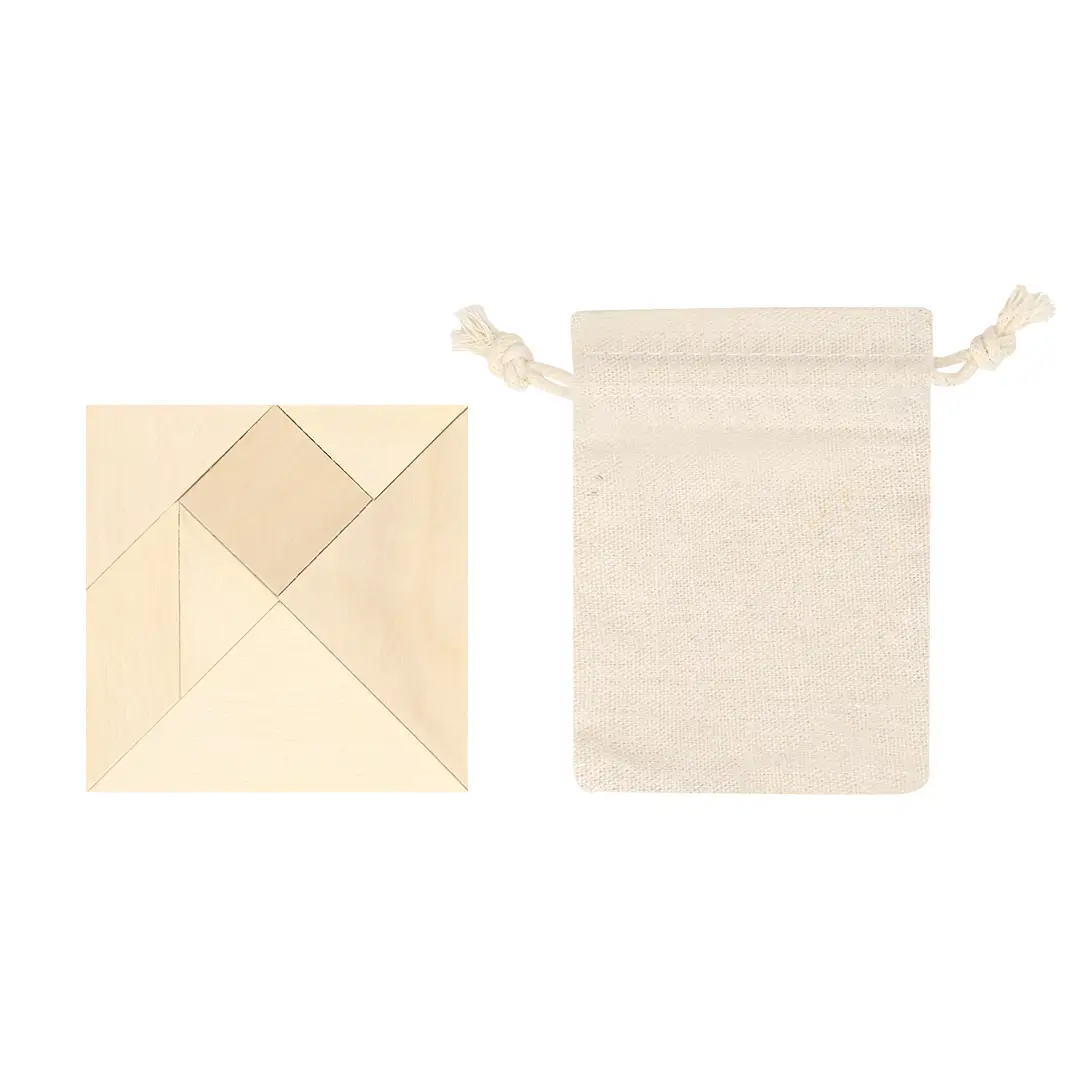 Puzzle con piezas de madera para despertar el ingenio y habilidad de los más pequeños. En bolsita de algodón con cuerdas ajustables para cierre.