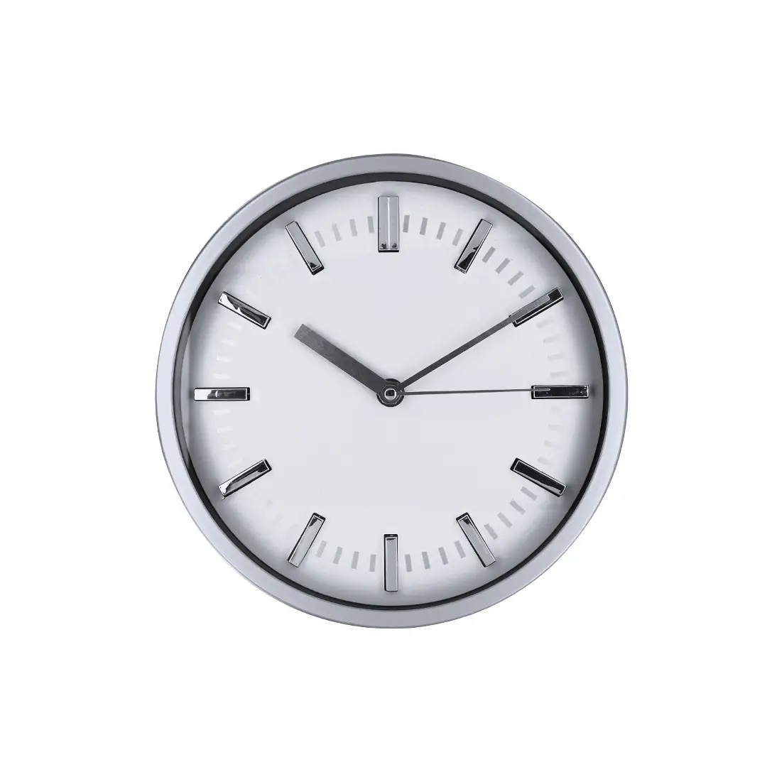 Reloj de pared fabricado con estructura de aluminio y vidrio. La esfera se distingue por marcadores de horas cromados y cuartos en tono plata, ofreciendo un estilo sofisticado y funcional.Alimentación a pilas (1xAA no incluida).