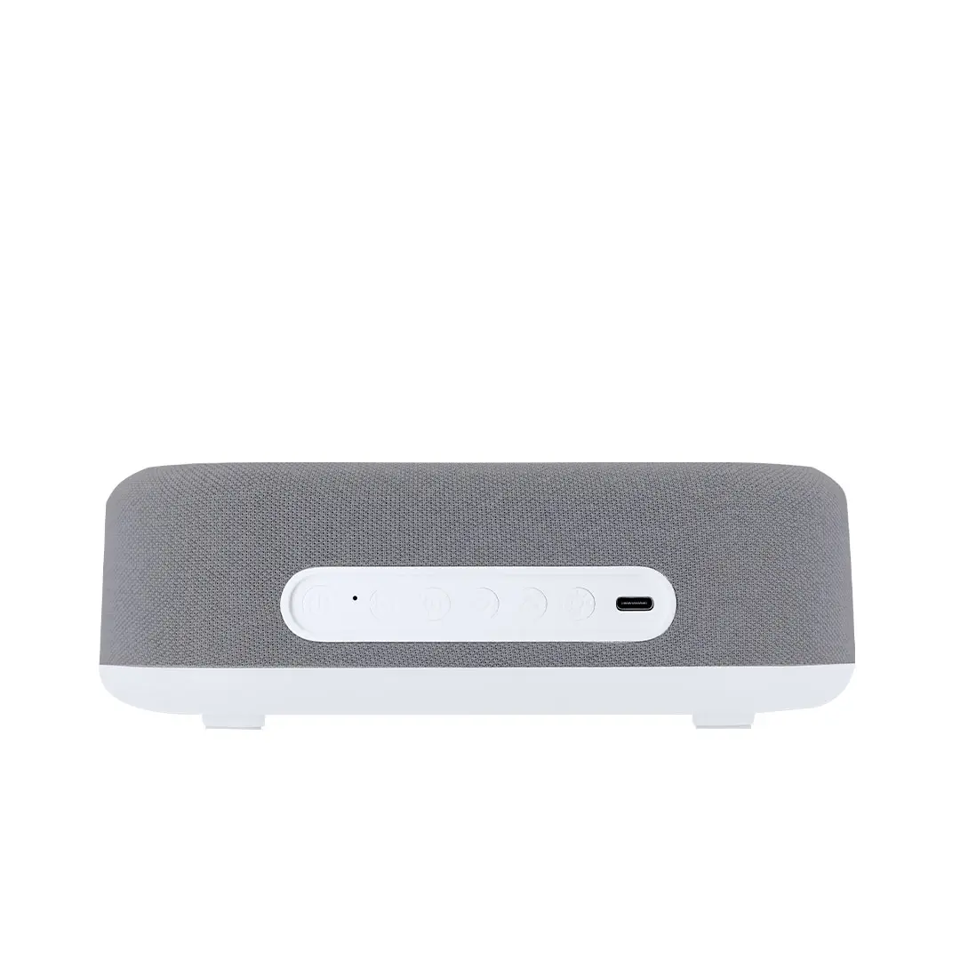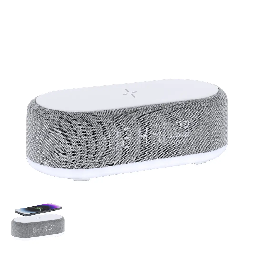 Reloj multifunción 5 en 1. Incluye múltiples funciones:-Cargador inalámbrico de 15W- Lámpara con luz cálida e intensidad regulable, ideal para crear ambientes agradables- Altavoz de 5W- Función hora (12/24h) y alarma- Indicador de temperatura y fechaCon pantalla retroiluminada y batería de 1200 mAh. Compatible con dispositivos equipados con tecnología de carga inalámbrica Qi. Fabricado en ABS blanco en combinación de poliéster. Con entrada USB Tipo C -cable incluido -.