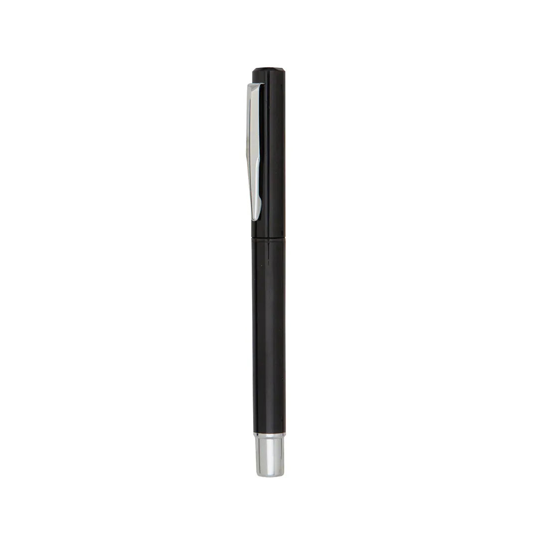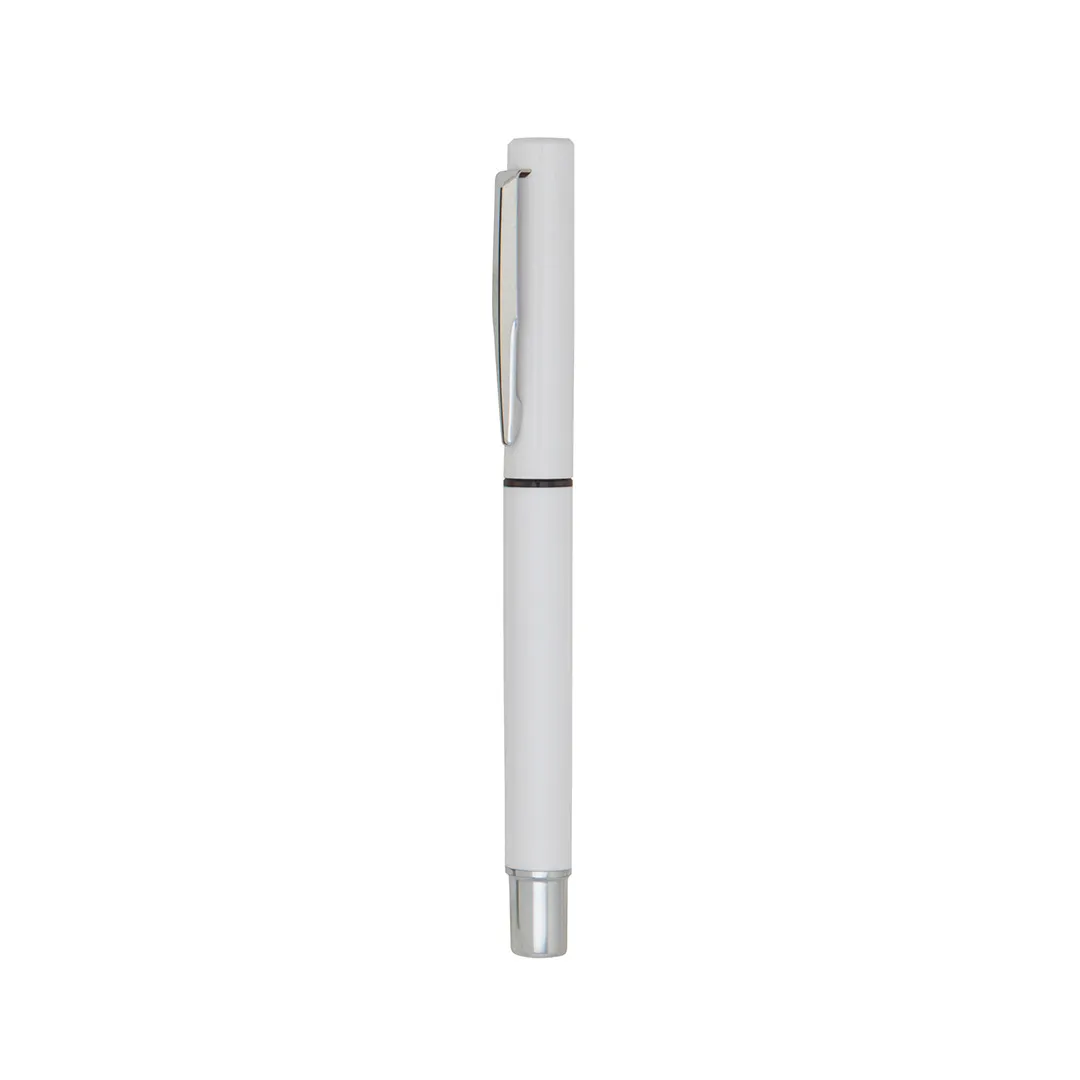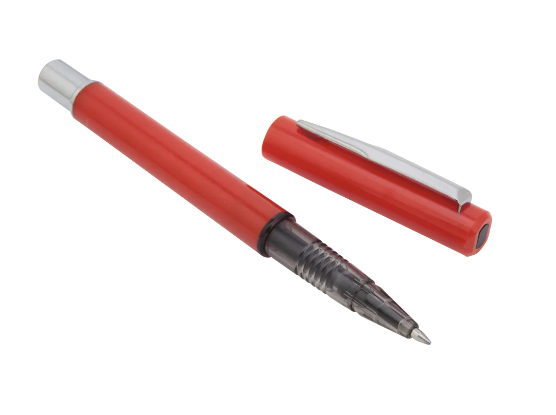 Roller de capucha con cuerpo de suave acabado sólido en colores cálidos. Con accesorios en color plateado y punta de acabado transparente, clip metálico y tinta azul.