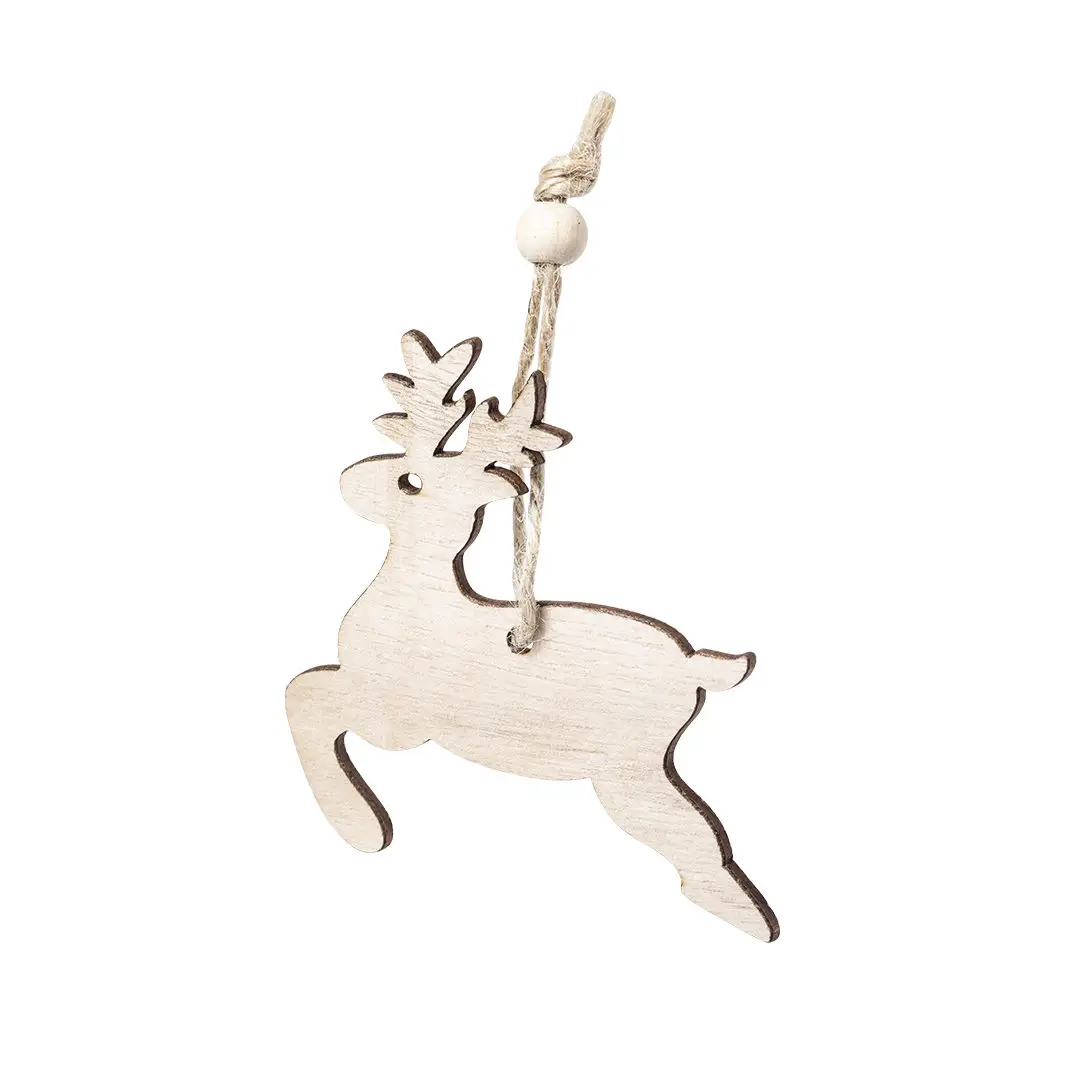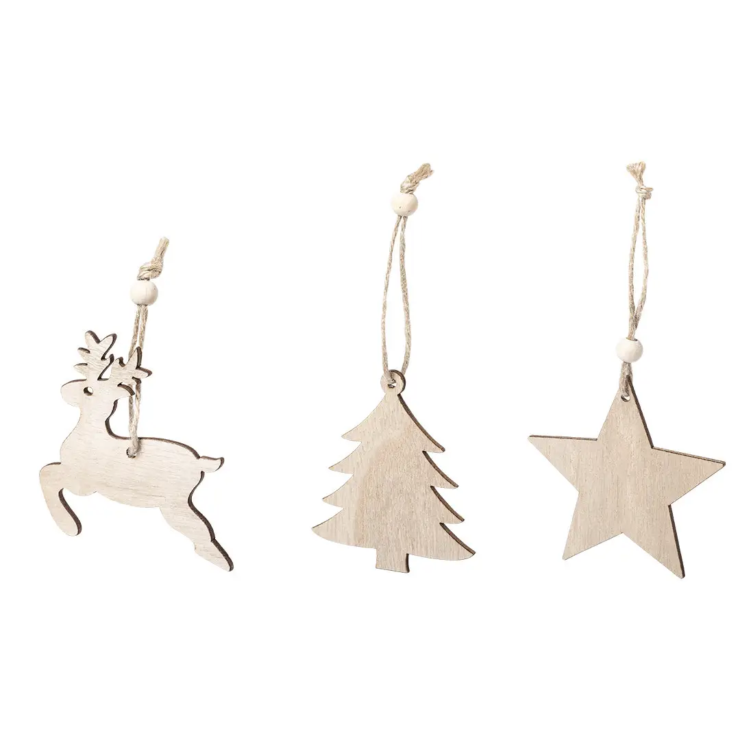 Set de 3 figuras navideñas de línea nature para colgar, fabricadas en madera de tacto suave. Cordón en yute con bolita para ajuste. Incluye reno, estrella y árbol de navidad. Presentado en bolsa individual con cartón interior en color natural.