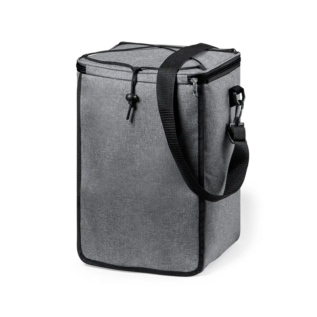 Set de barbacoa con 3 accesorios. Incluye: Bolsa de transporte/nevera fabricada en resistente poliéster RPET 300D, elaborado a partir de plástico reciclado, para así fomentar la reutilización de residuos plásticos y ayudar a la sostenibilidad del planeta. Con cinta para hombro ajustable de cierre de mosquetón e interior isotermo en PEVA, para conservar la temperatura de los alimentos. Distintivo RPET en etiqueta etiqueta exterior. Paleta, pinzas y trinchador metálicos, con mangos en color negro.