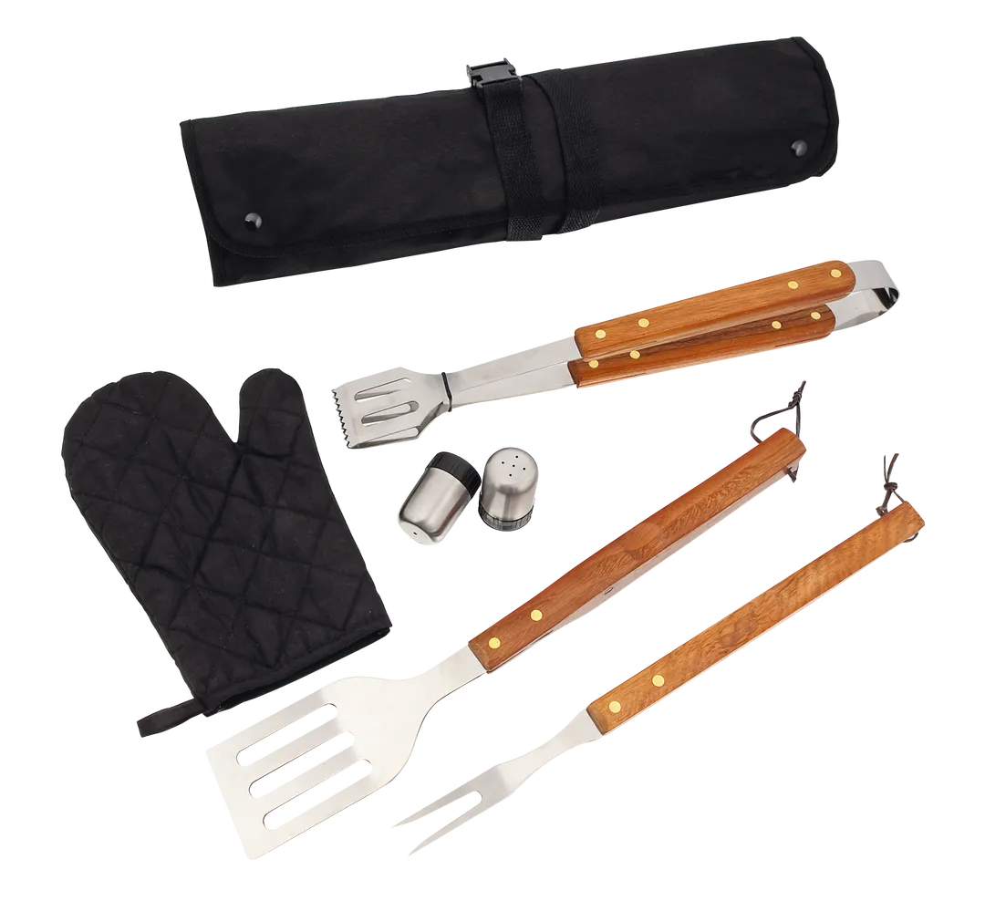 Set de barbacoa de 7 accesorios. Incluye paleta, trinchador y pinzas de acero inox con mango de madera. Con manopla acolchada y botes dosificadores para sal y pimienta. Presentado en estuche de resistente poliéster 600D en color negro con cierre de botones metálicos. Con cinta de transporte ajustable con cierre de clic en resistente nylon.