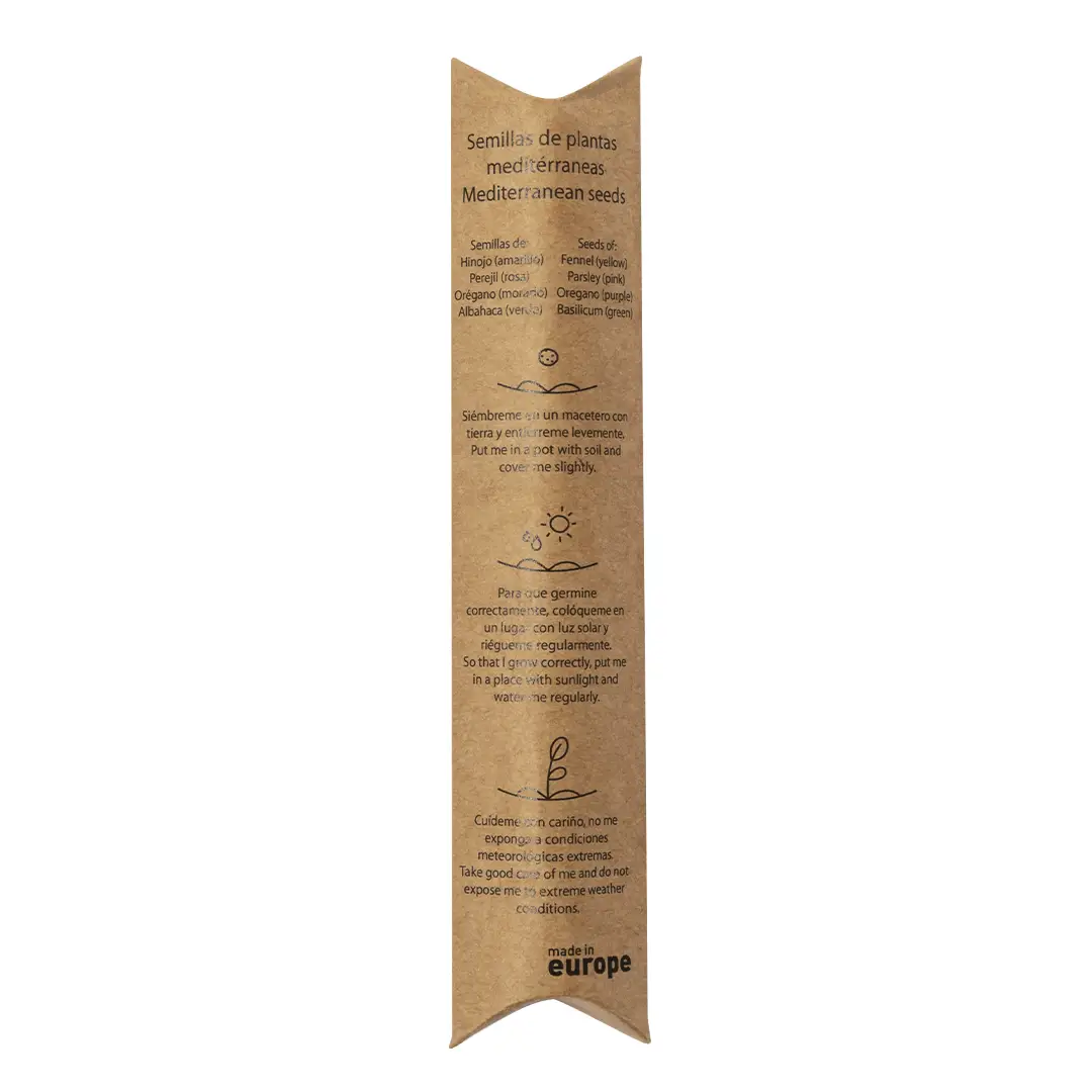 Set de bombón con semillas presentado en recipiente de plástico con tapón de corcho. Este kit de huerto contiene semillas de albahaca, hinojo, perejil y orégano. Presentado y protegido dentro de un sobre de cartón reciclado con instrucciones de plantado.