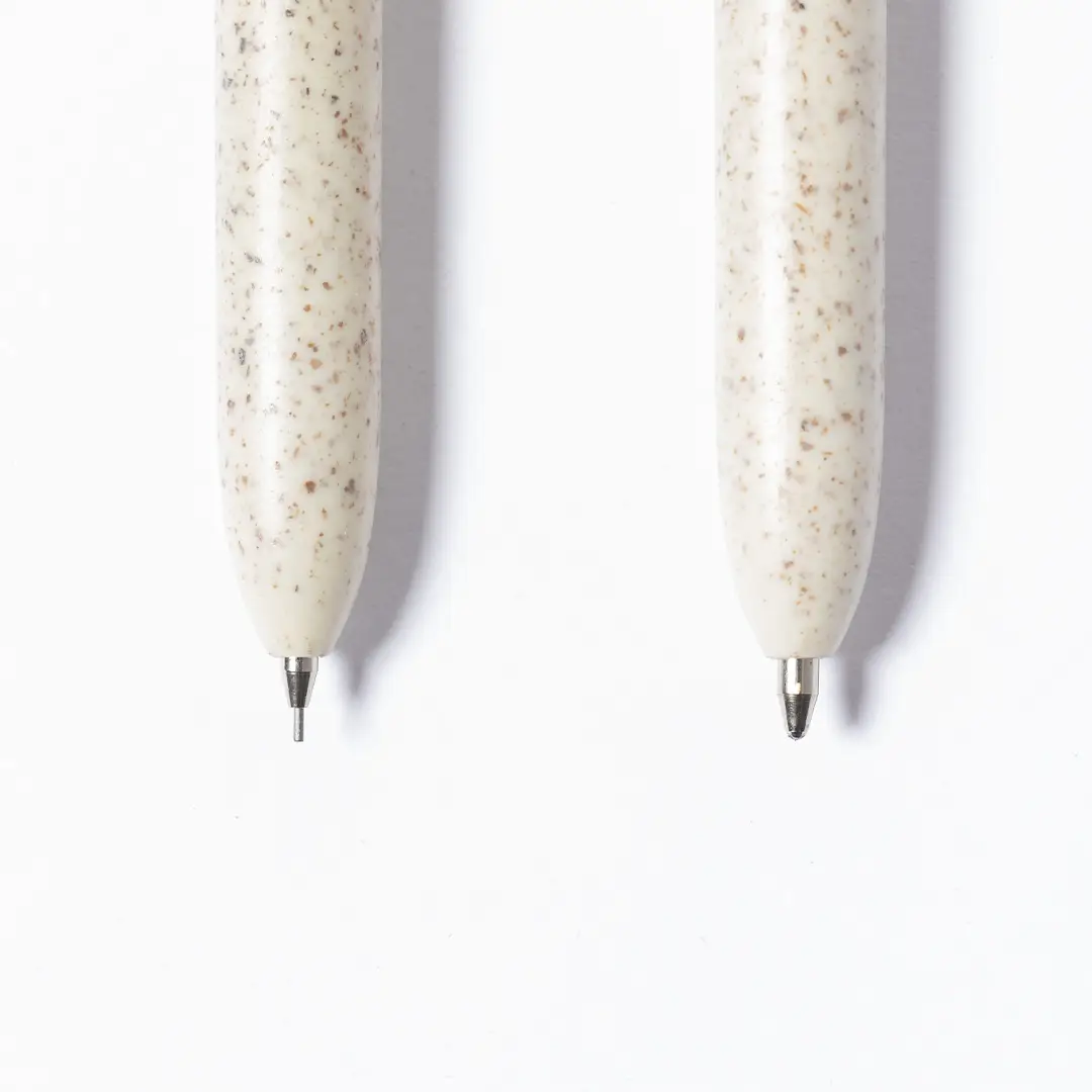 Set de bolígrafo y portaminas de línea nature. Fabricado en combinación de caña de trigo con clip en bambú, para así fomentar la utilización de materias primas naturales y reducir las emisiones contaminantes. Clip con amplia zona de marcaje. Bolígrafo en tinta azul y portaminas con 2 minas incluidas de 0,5mm. Presentado en estuche individual de cartón reciclado.Distintivo Wheat Straw en la parte superior del bolígrafo y portaminas.