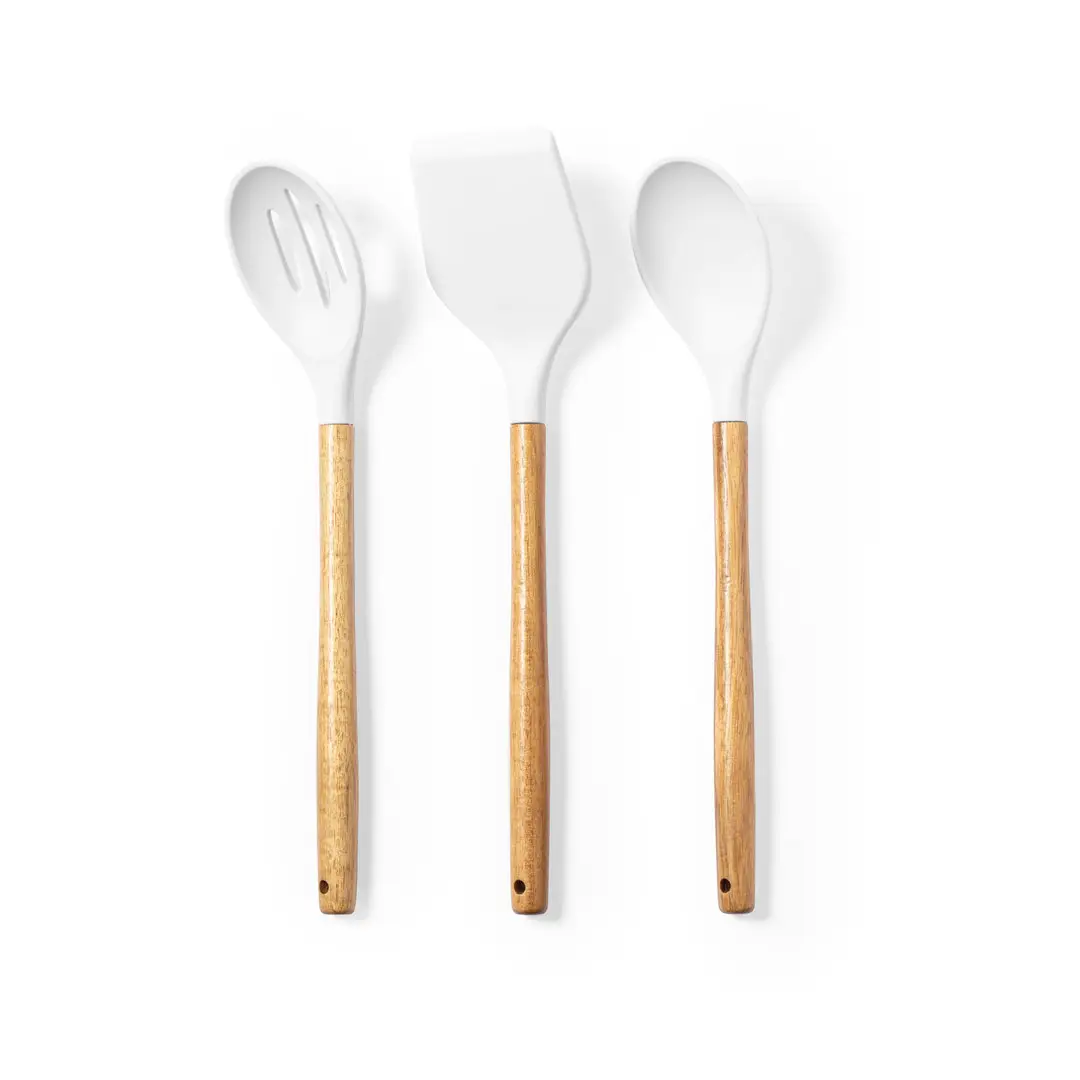 Set de cocina de 3 piezas, con mango fabricado en madera de acacia natural y accesorios en silicona. Incluye cuchara, paleta y espumadera, con base de cerámica a juego. Presentación en caja individual de diseño kraft.