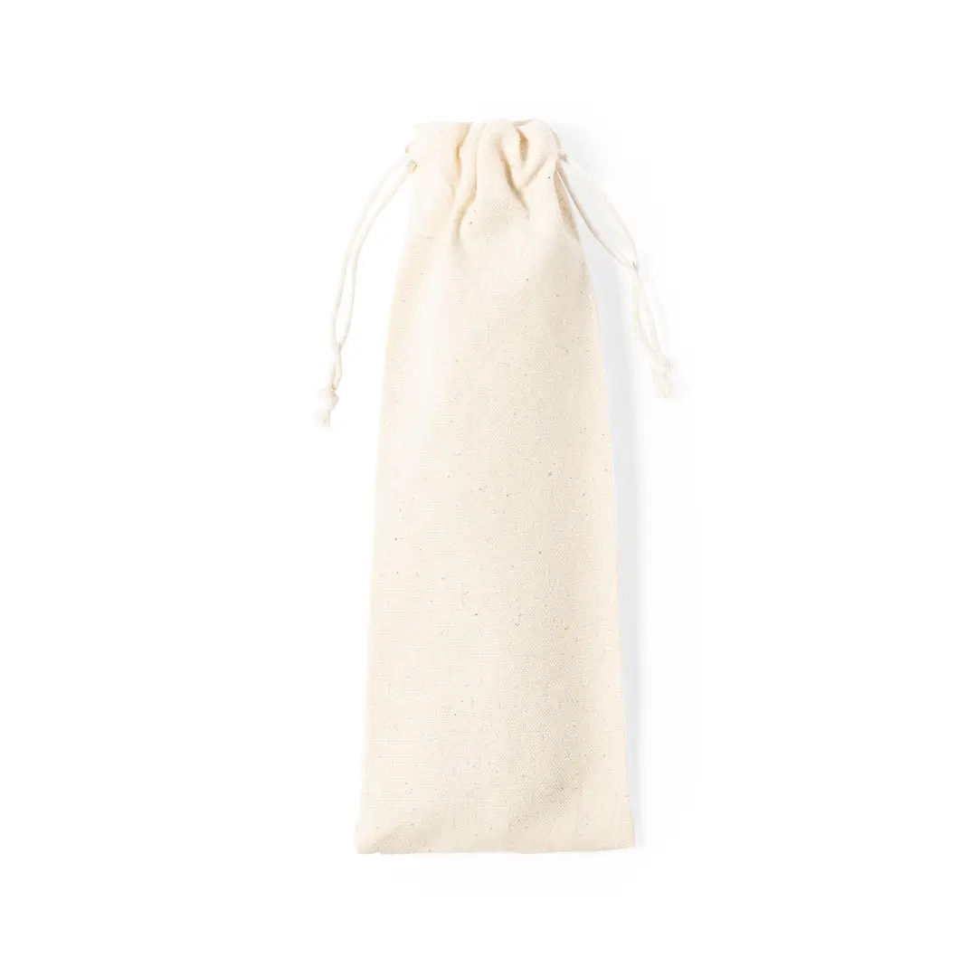 Set de cubiertos de 5 piezas fabricados en acero inox, con mango en madera natural. Incluye cuchara, tenedor, cuchillo, pajita reutilizable y cepillo limpiador para la pajita. Presentación en funda de algodón natural con cordón de cierre.