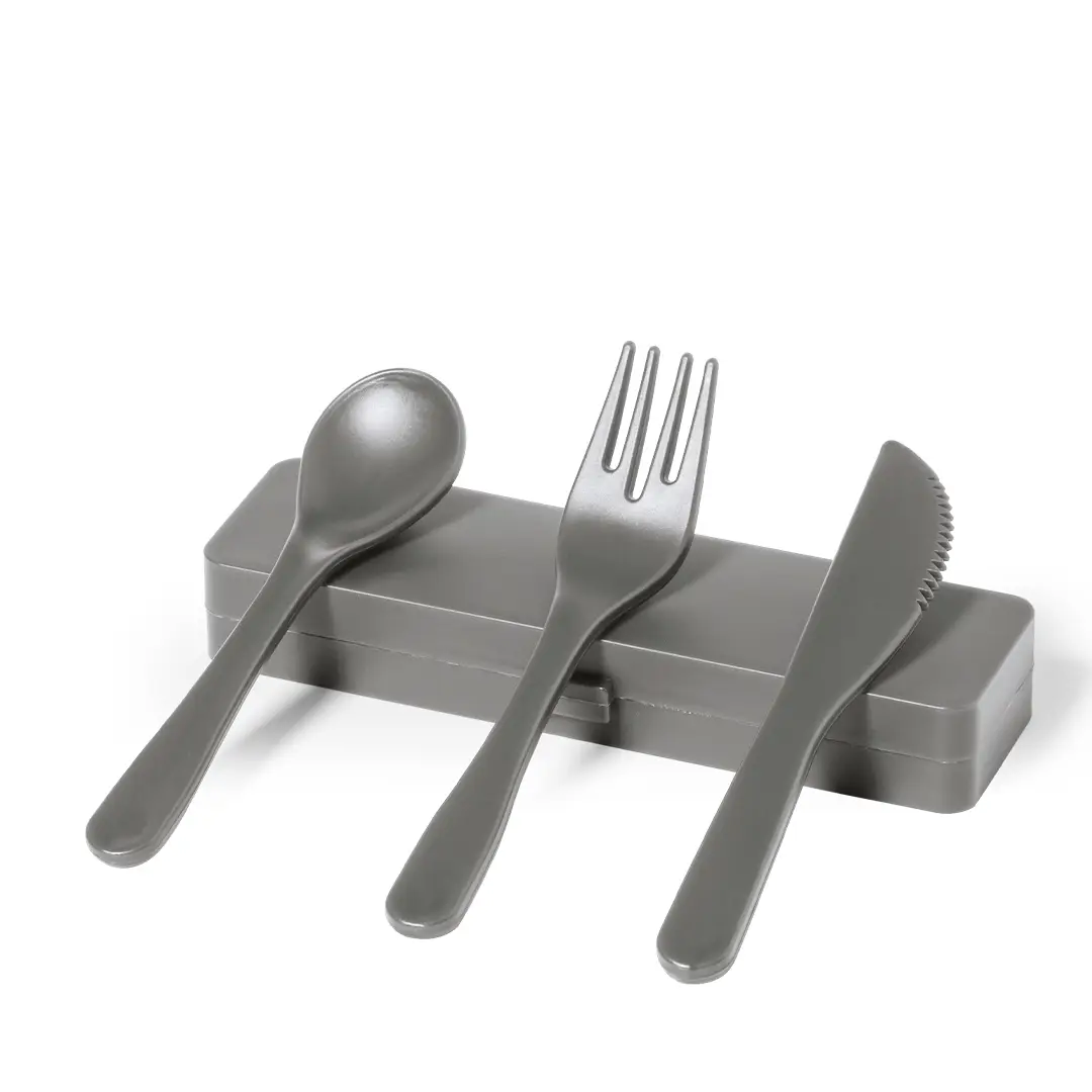 Set de cubiertos fabricados en PP reciclado libre de BPA, con estuche de presentación a juego. Incluye cuchara, tenedor y cuchillo. Dispone de Certificación Food Grade, garantizando la seguridad cuando los alimentos entran en contacto con el material usado para fabricar el producto. Estuche esterior y cubiertos en acabado mate disponibles en variada gamas de colores. Presentados en bolsa individual reciclada.El PP reciclado es un plástico reciclado y altamente reciclable, de gran resistencia y apto para multitud de aplicaciones.