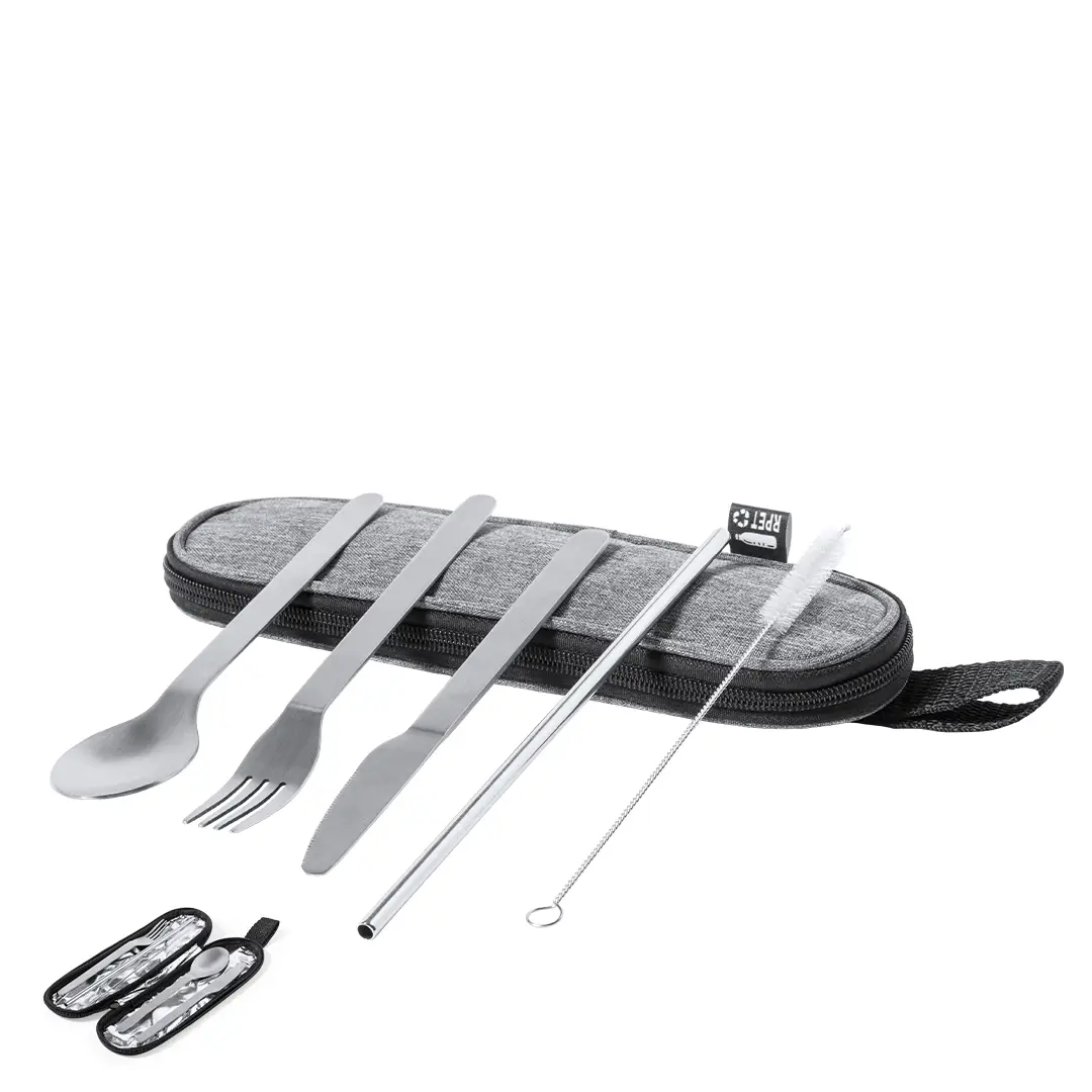 Set de cubiertos reutilizables fabricados en resistente y duradero acero inox. Incluye cuchara, cuchillo, tenedor, pajita y accesorio de limpieza. Presentados en elegante estuche individual de poliéster 300D RPET, elaborado a partir de plástico reciclado para así fomentar la reutilización de residuos plásticos y ayudar a la sostenibilidad del planeta. Estuche con cinta de transporte, cierre de cremallera y distintivo RPET en etiqueta.
