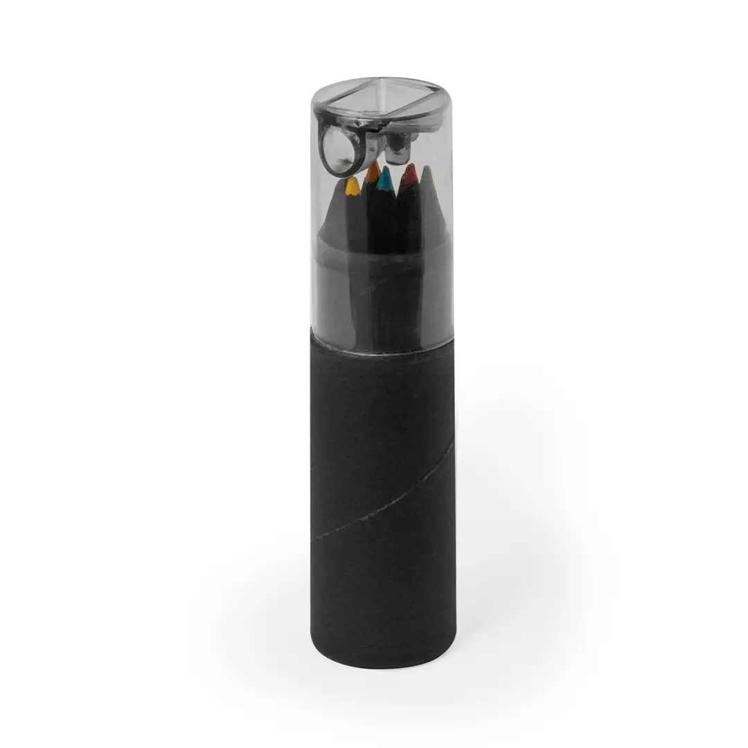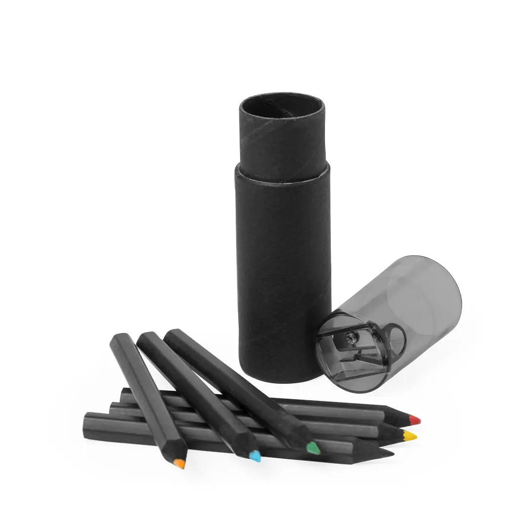 Set de 6 lápices de madera acabada en color negro, con cuerpo hexagonal y minas en varios colores. Presentados en estuche cilíndrico de cartón reciclado negro, con capucha transparente a juego y sacapuntas integrado.