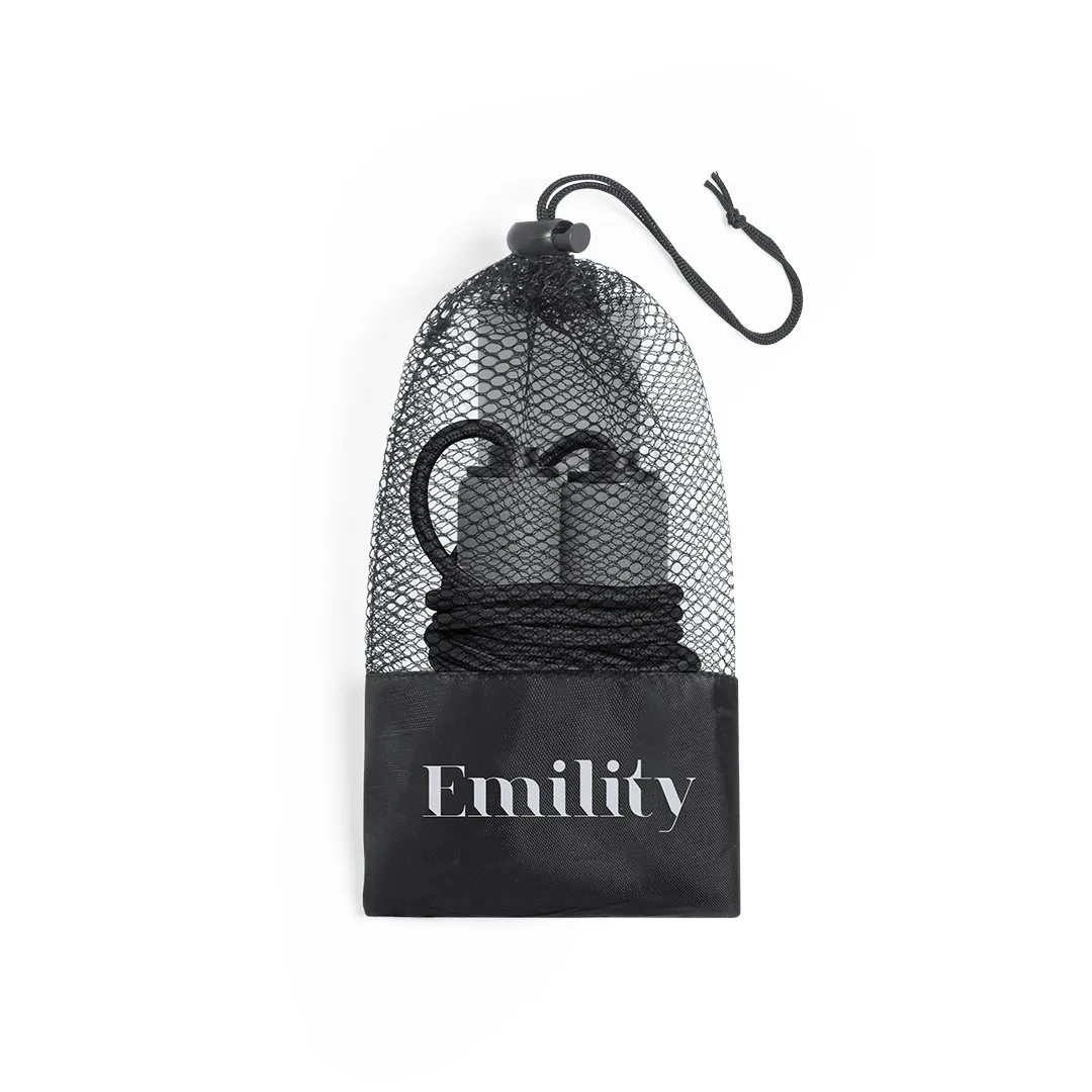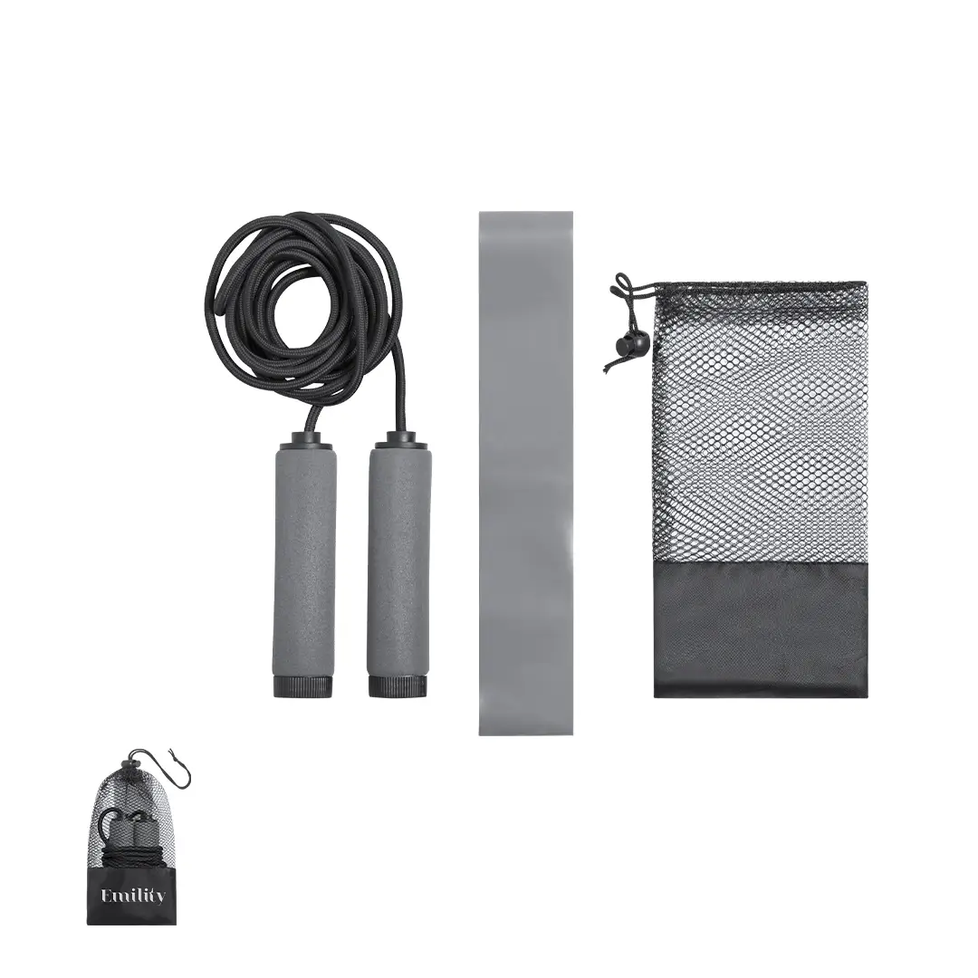 Set de goma elástica y comba para los más deportistas. Incluye: 1 cinta de 25×5 cm fabricada en resistente material TPE y resistencia media 1 comba de 260 cm, con mangos en resistente material HIPS forrados en EVA. Presentado en funda de poliéster con cierre de cordón y accesorio de ajuste.