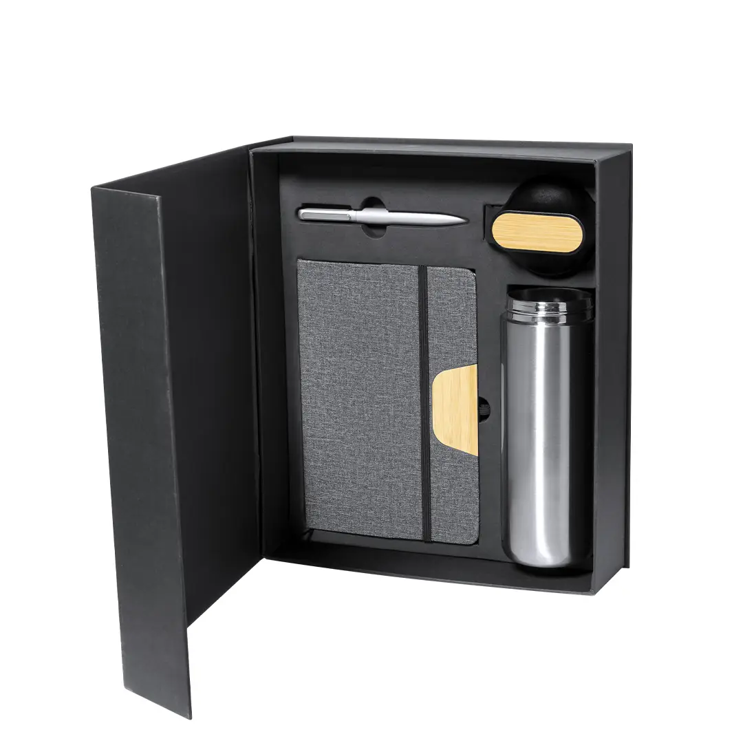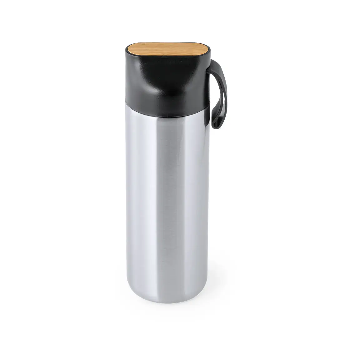Elegante set premium que incluye: Termo de doble capa en acero inoxidable de acabado mate y de 640 ml de capacidad, con detalle de bambú en el tapón para marcaje. Bloc de notas en suave polipiel, con soporte para smartphone integrado en la portada y detalle en bambú para marcaje. Incluye cierre elástico, marcapáginas y soporte para bolígrafo a juego. Interior con 80 hojas de disposición a una raya. Bolígrafo en aluminio de acabado mate con detalle en bambú para marcaje, de mecanismo giratorio y tinta azul. Presentado en estuche individual de acabado mate y cierre magnético, con troquelado interior para cada uno de los elementos del set.