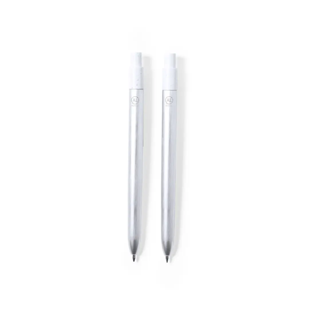 Set eco-friendly de bolígrafo y roller, fabricados en aluminio reciclado y con detalles en ABS reciclado (RABS). Incluye: Bolígrafo en aluminio reciclado de mecanismo pulsador, con cuerpo en color plateado y accesorios en blanco. Con distintivo aluminio reciclado en la parte superior del bolígrafo, cartucho jumbo y tinta azul. Roller en aluminio reciclado de mecanismo pulsador, con cuerpo en color plateado y accesorios en blanco. Con distintivo aluminio reciclado en la parte superior del roller, cartucho jumbo y tinta azul.Set presentado en estuche individual de diseño kraft con funda a juego.El origen del aluminio reciclado se encuentra en la reutilización casi infinita de uno de los materiales con mayor potencial de reciclabilidad sin perder sus propiedades. Esta característica lo convierte en un material eco-friendly de origen reciclado, fácilmente reciclable y de cuyos procesos de tratamiento y desechos para la obtención del material se pueden obtener nuevos recursos reutilizables, consumiendo menos energía en su fabricación, entre otros factores de sostenibilidad.Certificación GRS (Global Recycled Standard / Estándar de Reciclaje Global), que garantiza el origen reciclado del material usado para fabricar el producto.