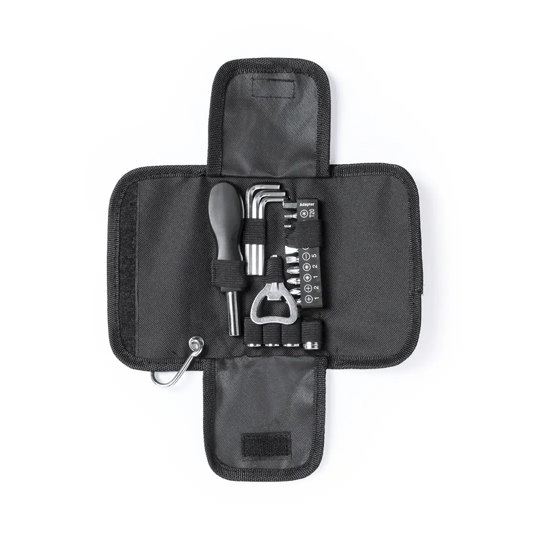 Set de herramientas de 19 accesorios en resistente estuche de poliéster con cierre de cremallera. Incluye herramienta de fijación, cabezales destornilladores planos, de estrella y tipo torx, set de llaves tipo allen, llaves para tuercas de cabeza hexagonal y abridor. Con mosquetón metálico de transporte.