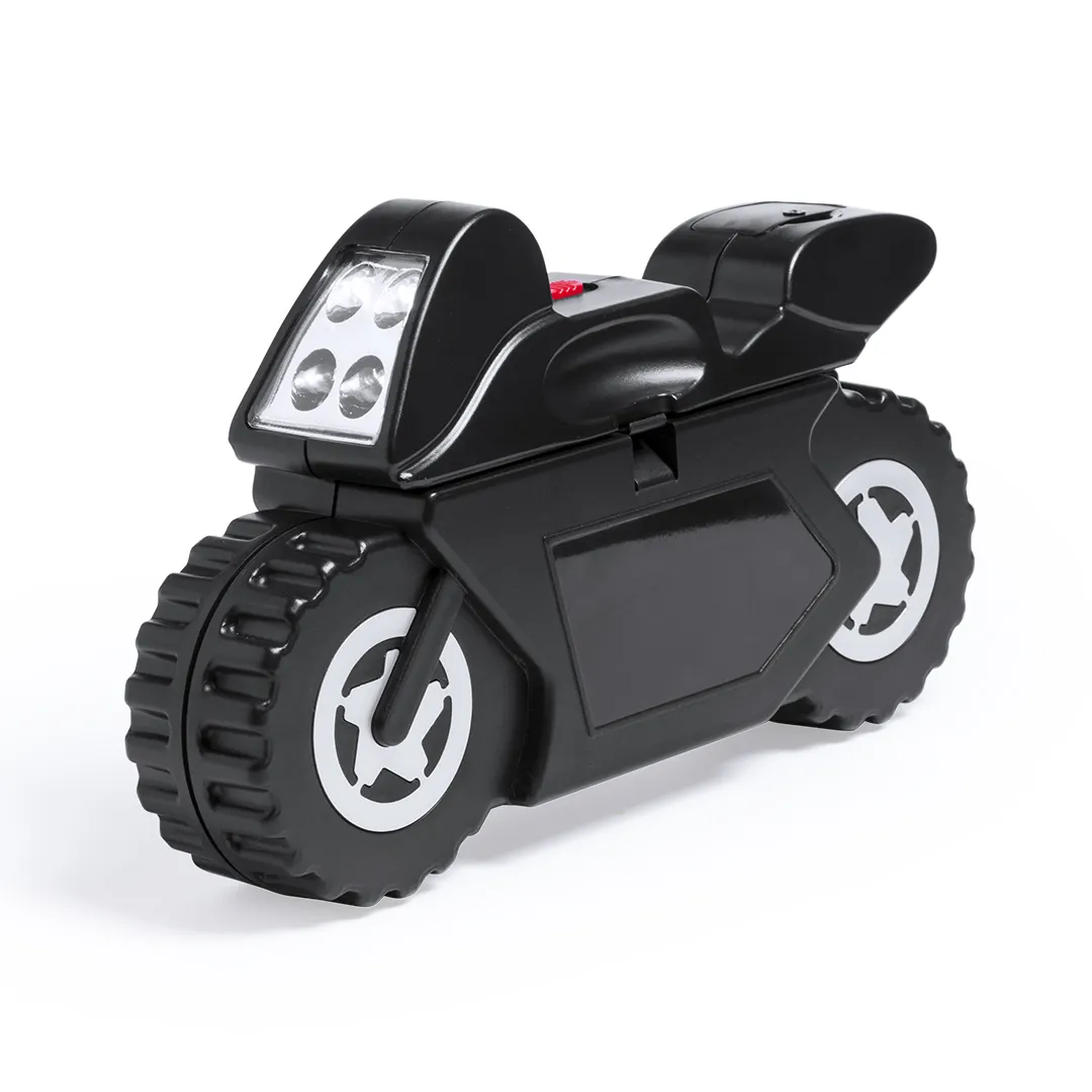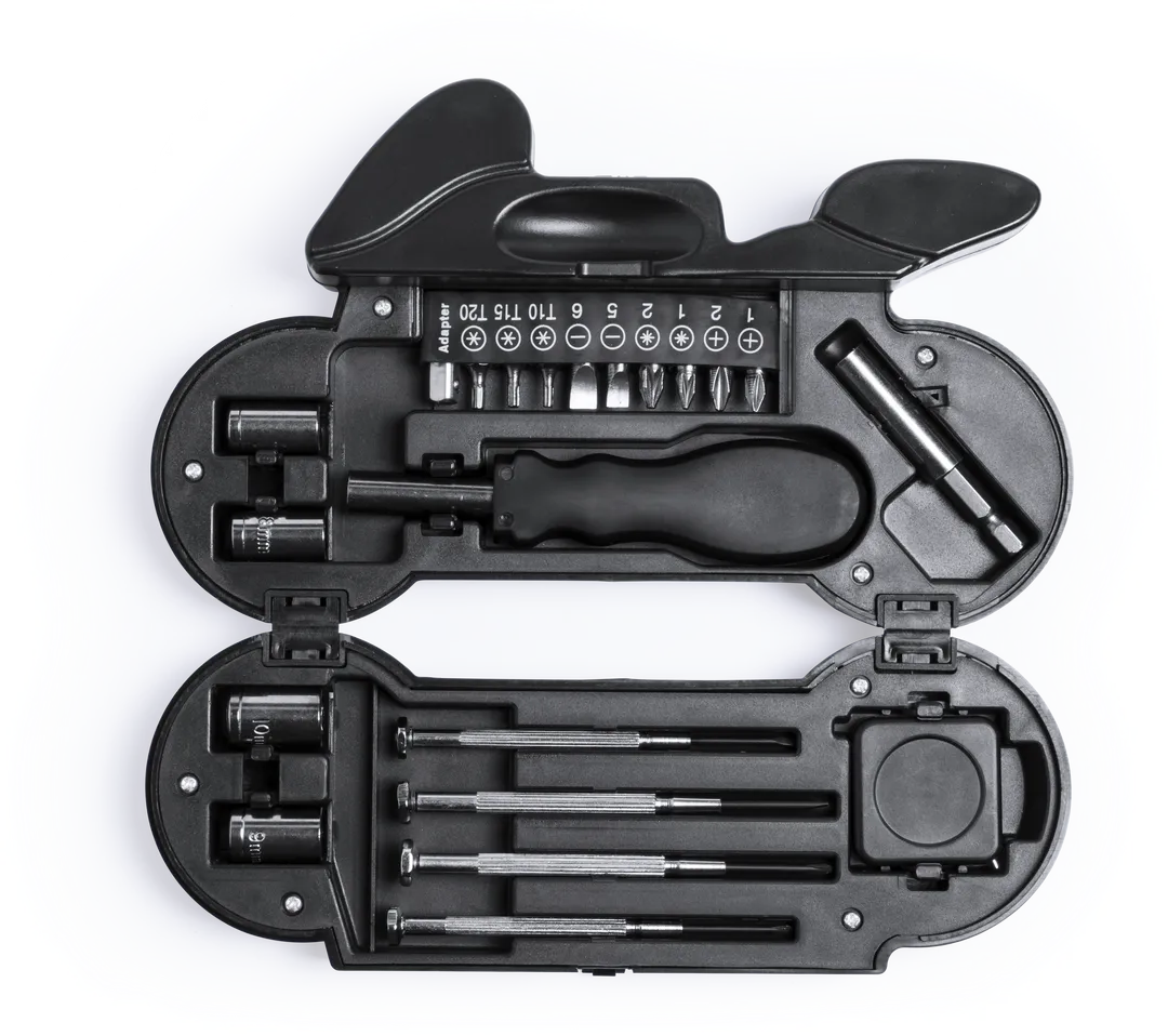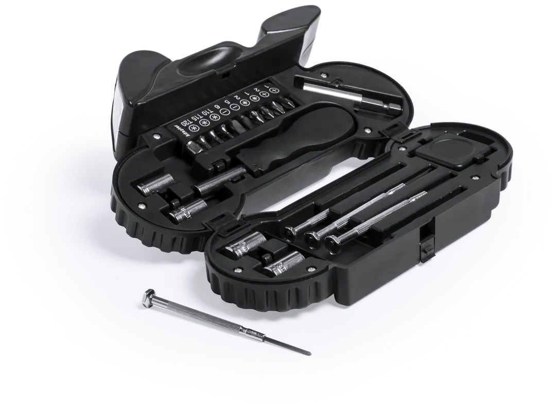 Set de herramientas de 14 accesorios en resistente estuche con diseño de moto, con linterna de 4 ledes integrada. Incluye set de destornilladores de precisión, herramienta de fijación, cabezales destornilladores planos y de estrella y llaves para tuercas de cabeza hexagonal. Pilas de botón incluidas. Presentado en caja individual.